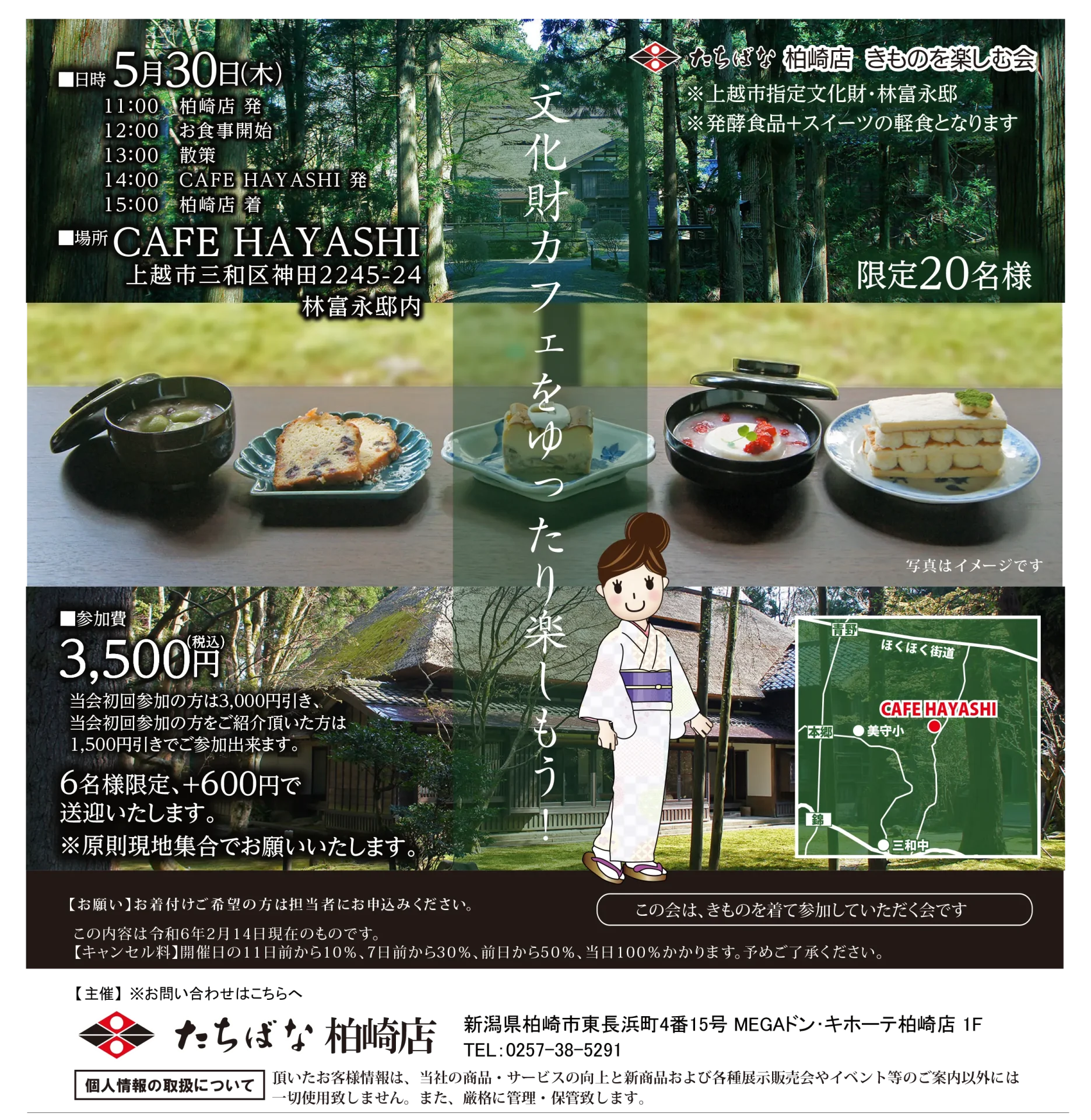 | 開催日時 | 5/30(木) 11:00 柏崎店発 12:00 お食事開始 13:00 散策 14:00 CAFE HAYASHI発 15:00 柏崎店着 |