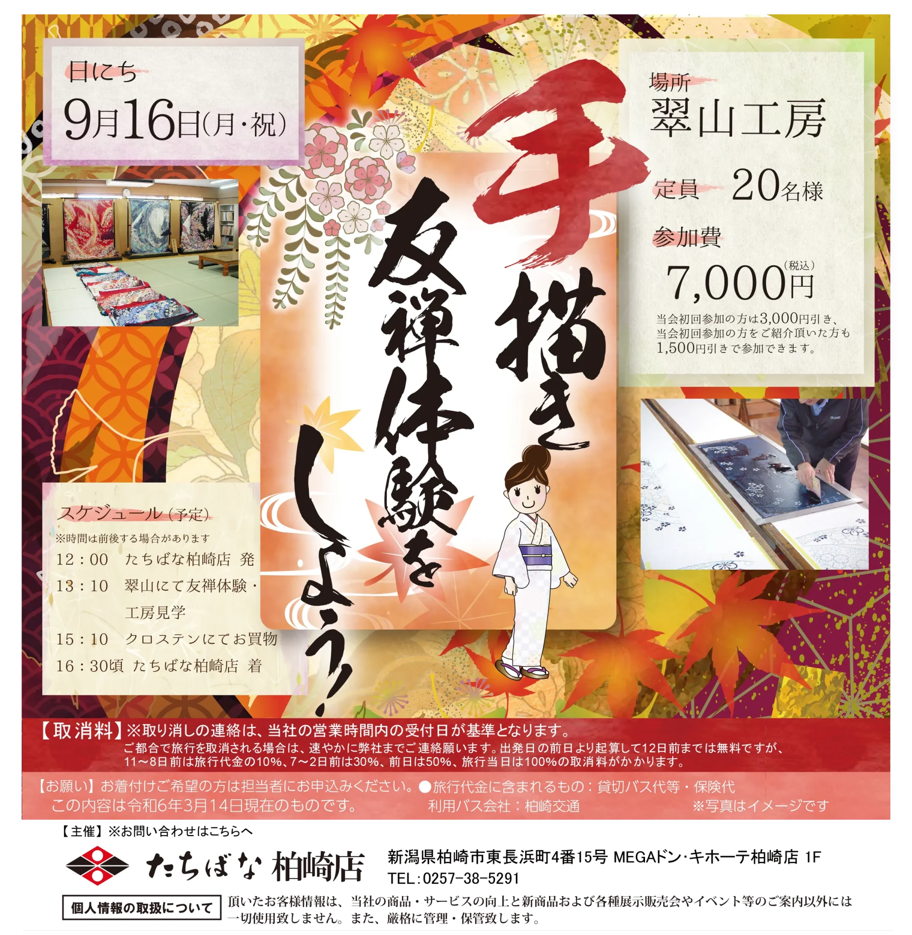 | 開催日時 | 9/16(月・祝) 12:00 たちばな柏崎店発 13:10 翠山にて友禅体験・工房見学 15:10 クロステンにてお買い物 16:30頃 たちばな柏崎店着 ※時間は前後する場合があります |