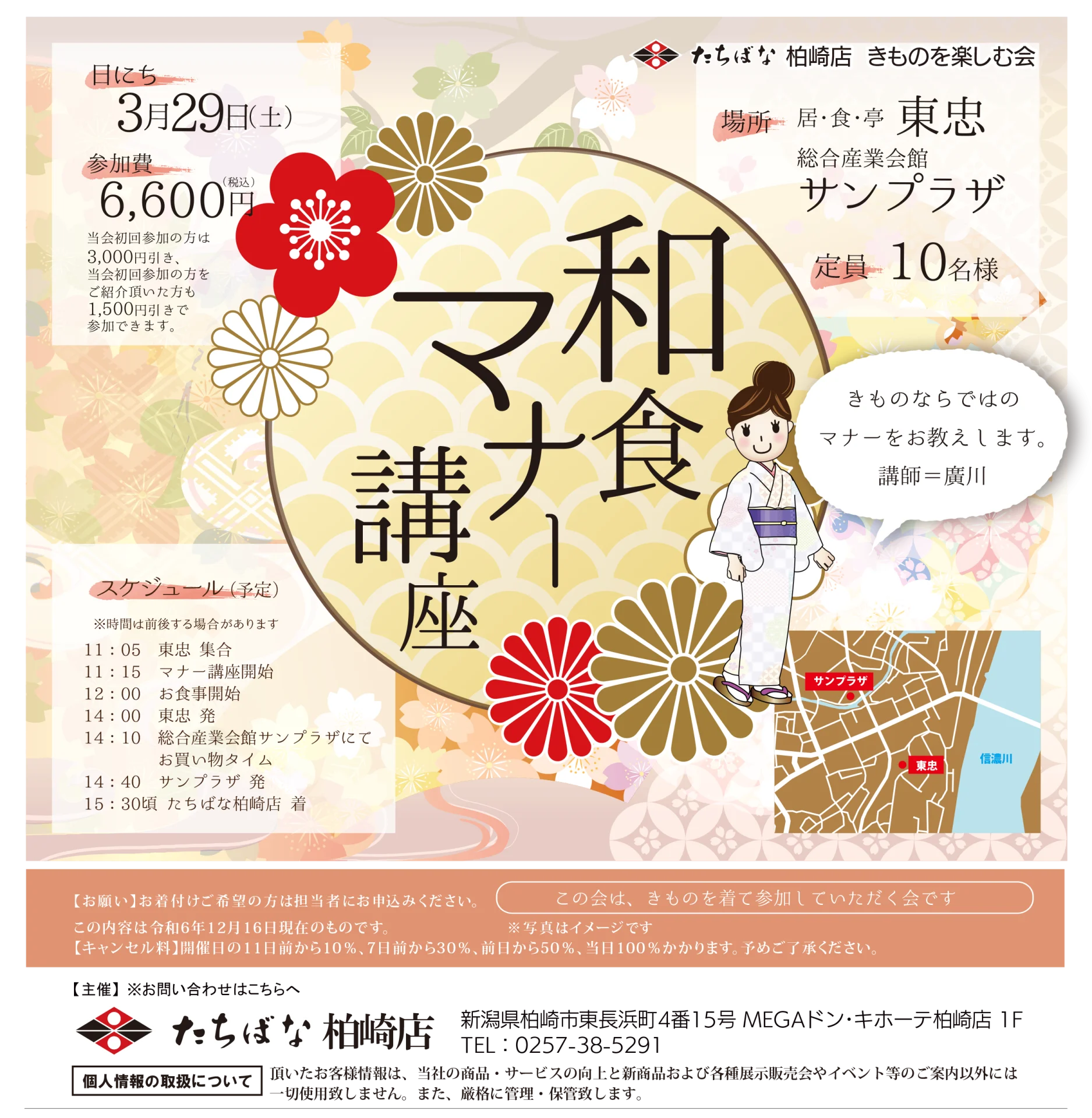 | 開催日時 | 3/29(土) スケジュール (予定) 11:05 東忠 集合 11:15 マナー講座開始 12:00 お食事開始 14:00 東忠 発 14:10 総合産業会館サンプラザにてお買い物タイム 14:40 サンプラザ 発 15:30頃 たちばな柏崎店 着 ※時間は前後する場合があります。 |