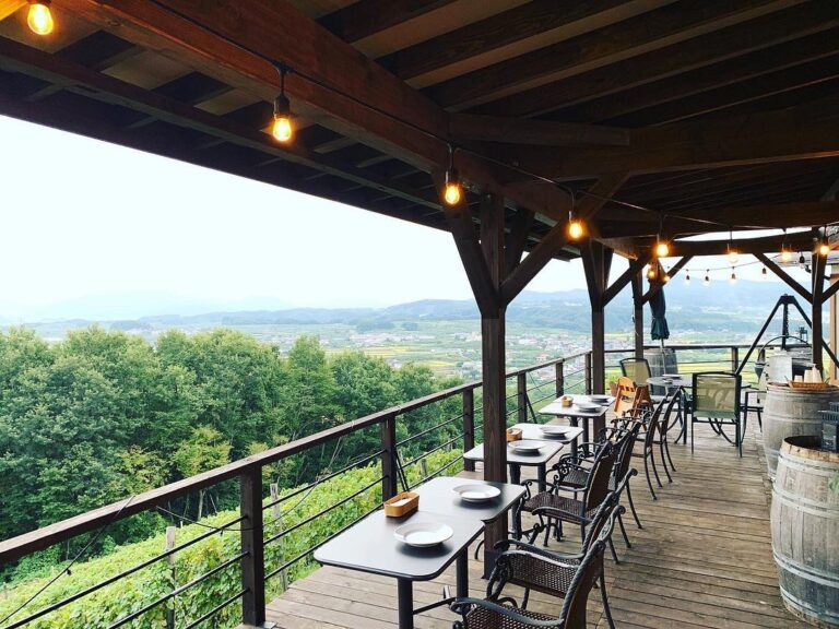 ○レストランのテラスからの眼下に広がるぶどう畑と飯綱町風景