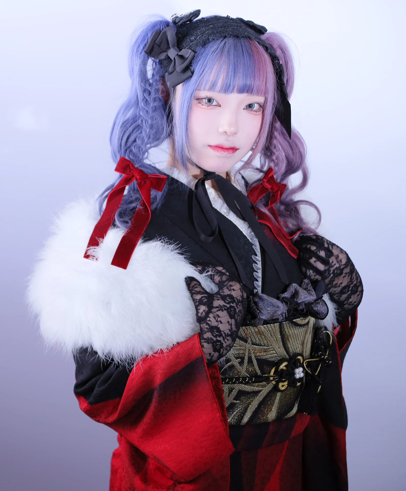 黒のヘッドドレスと編みこみ・みつあみの先についた赤いベロアリボンが振袖のデザインと相まって目を引きます…!