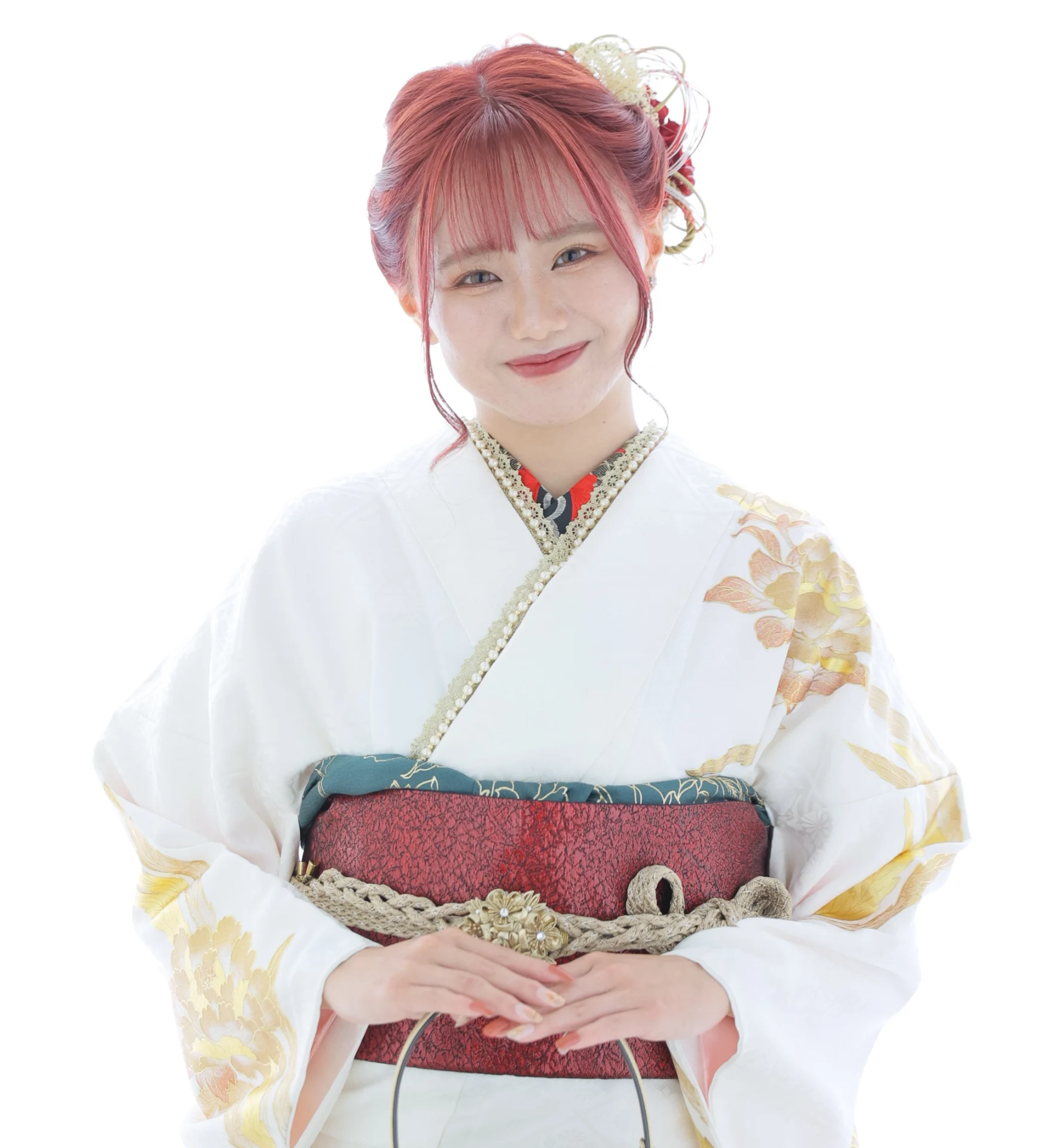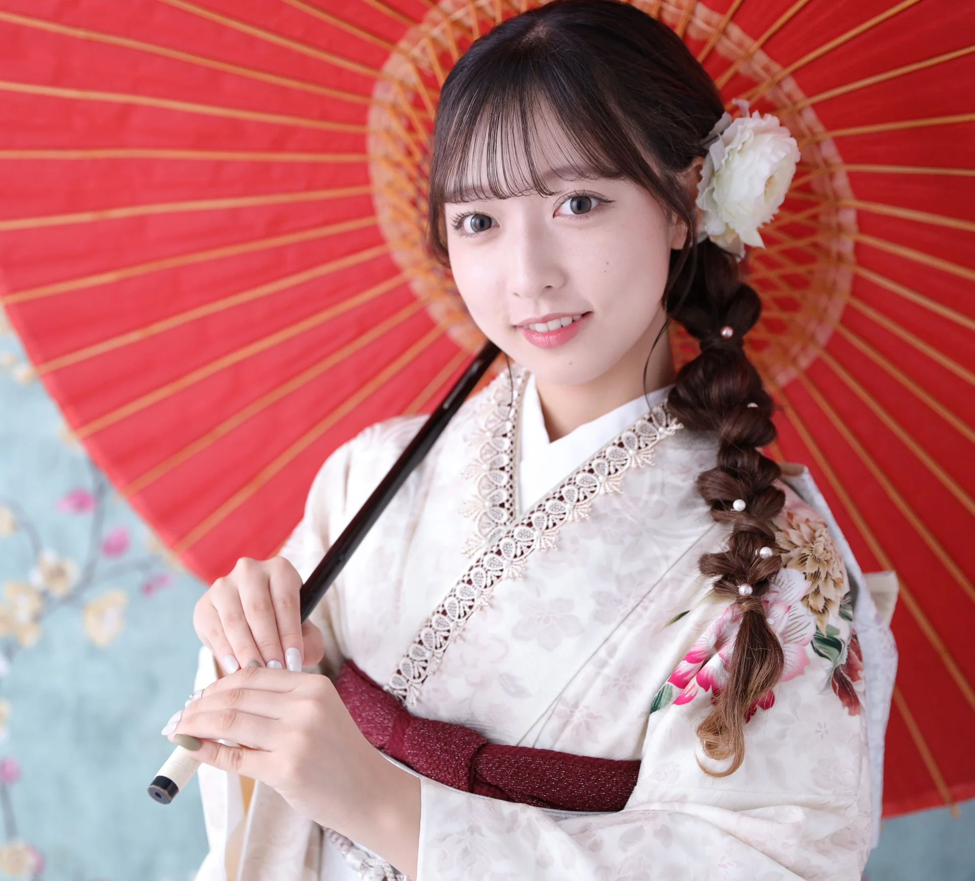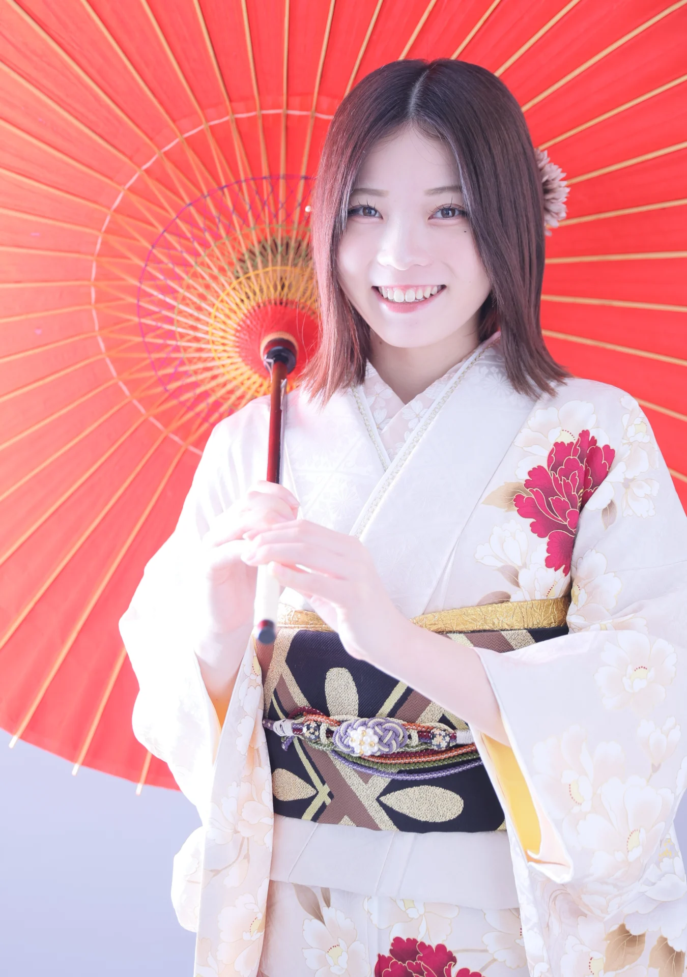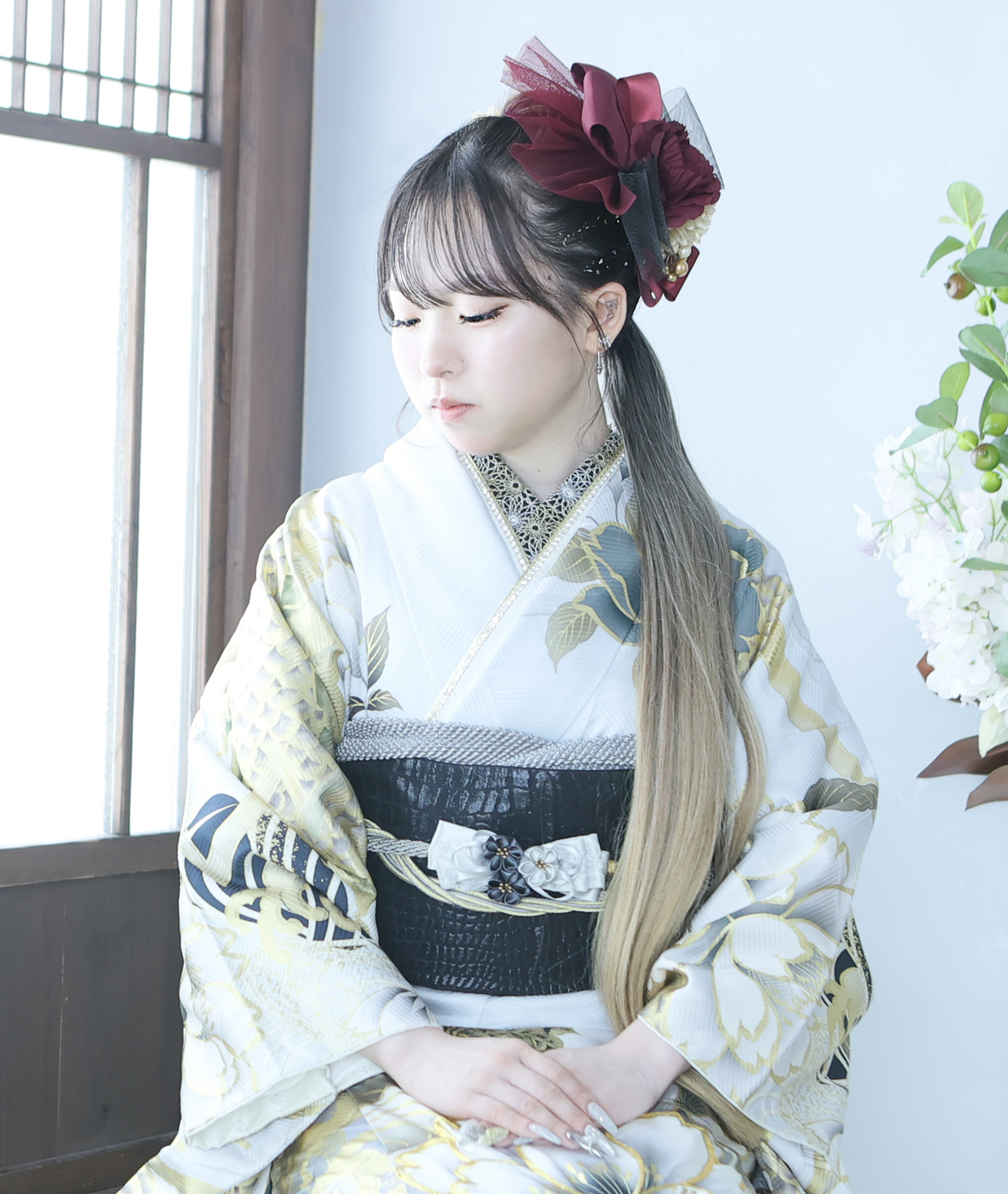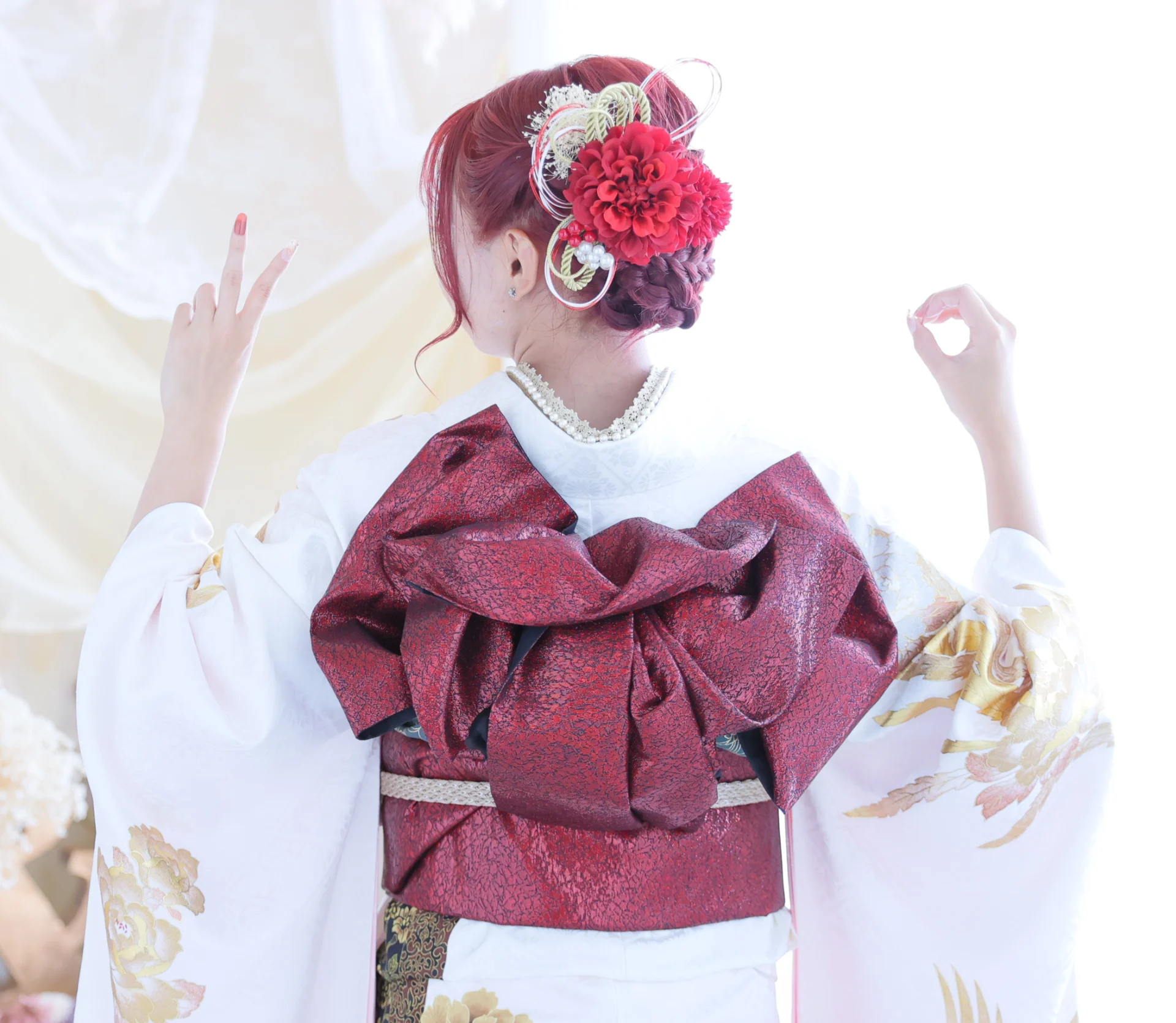 ヘアはシンプルにダウンスタイルにすることで、ヘアカラーの魅力をしっかり引き出し、赤と白の髪飾りにすることで帯締めや帯とリンクしたコーディネートに。