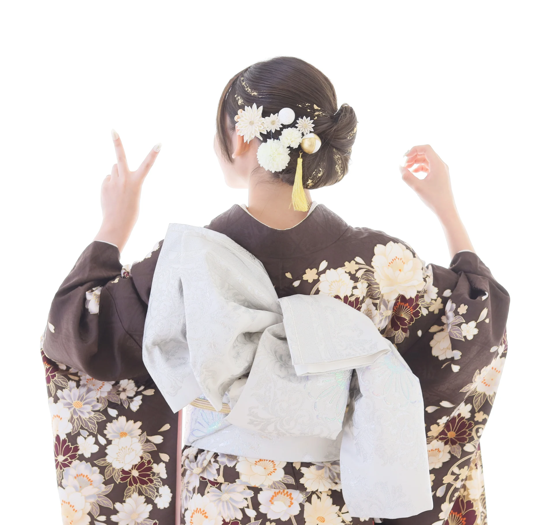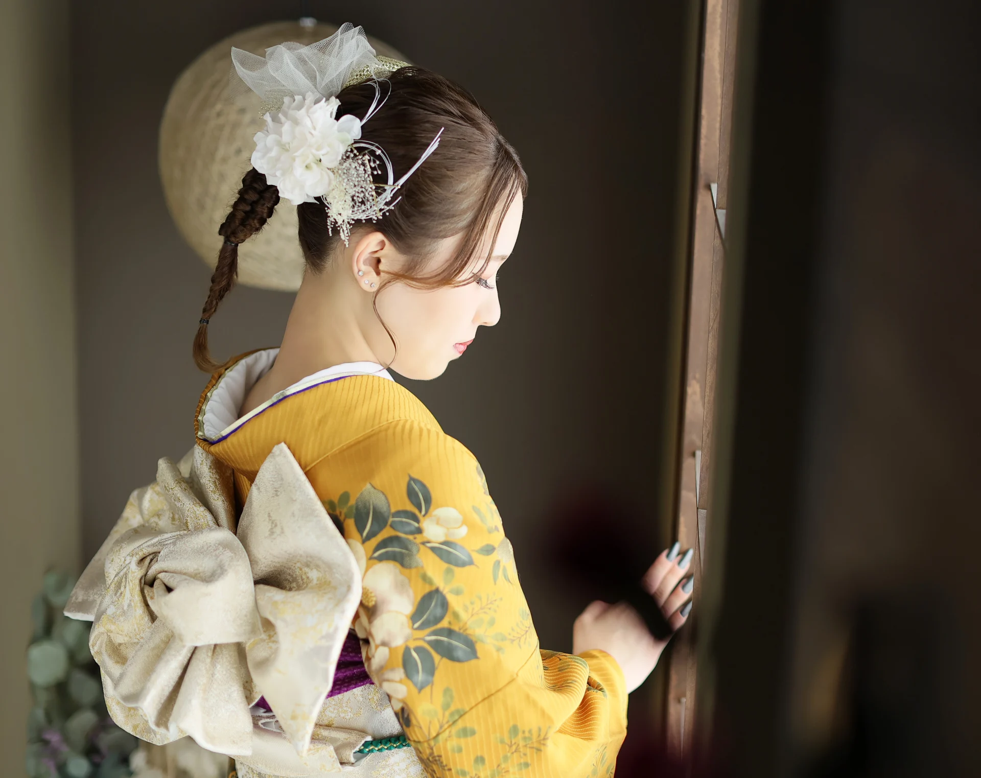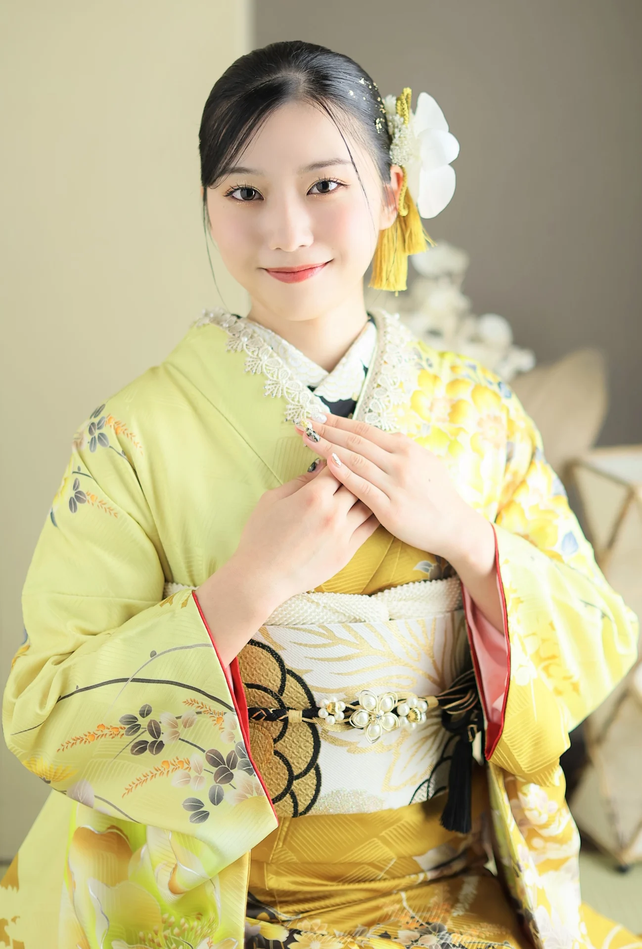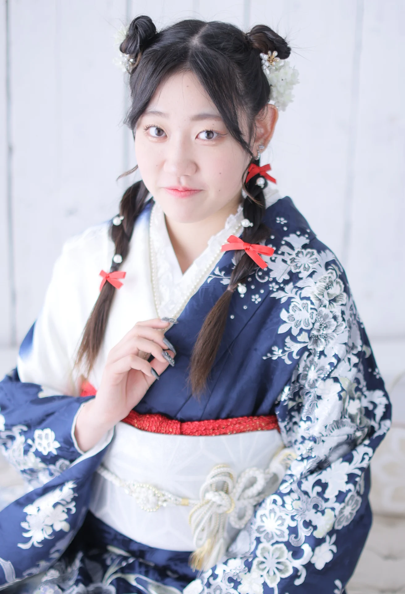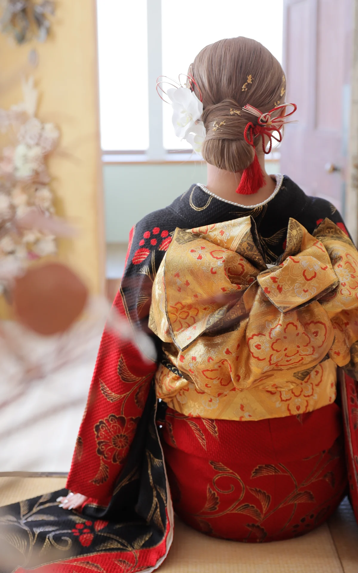 ヘアはシンプルにダウンスタイルにすることで、ヘアカラーの魅力をしっかり引き出し、赤と白の髪飾りにすることで帯締めや帯とリンクしたコーディネートに。