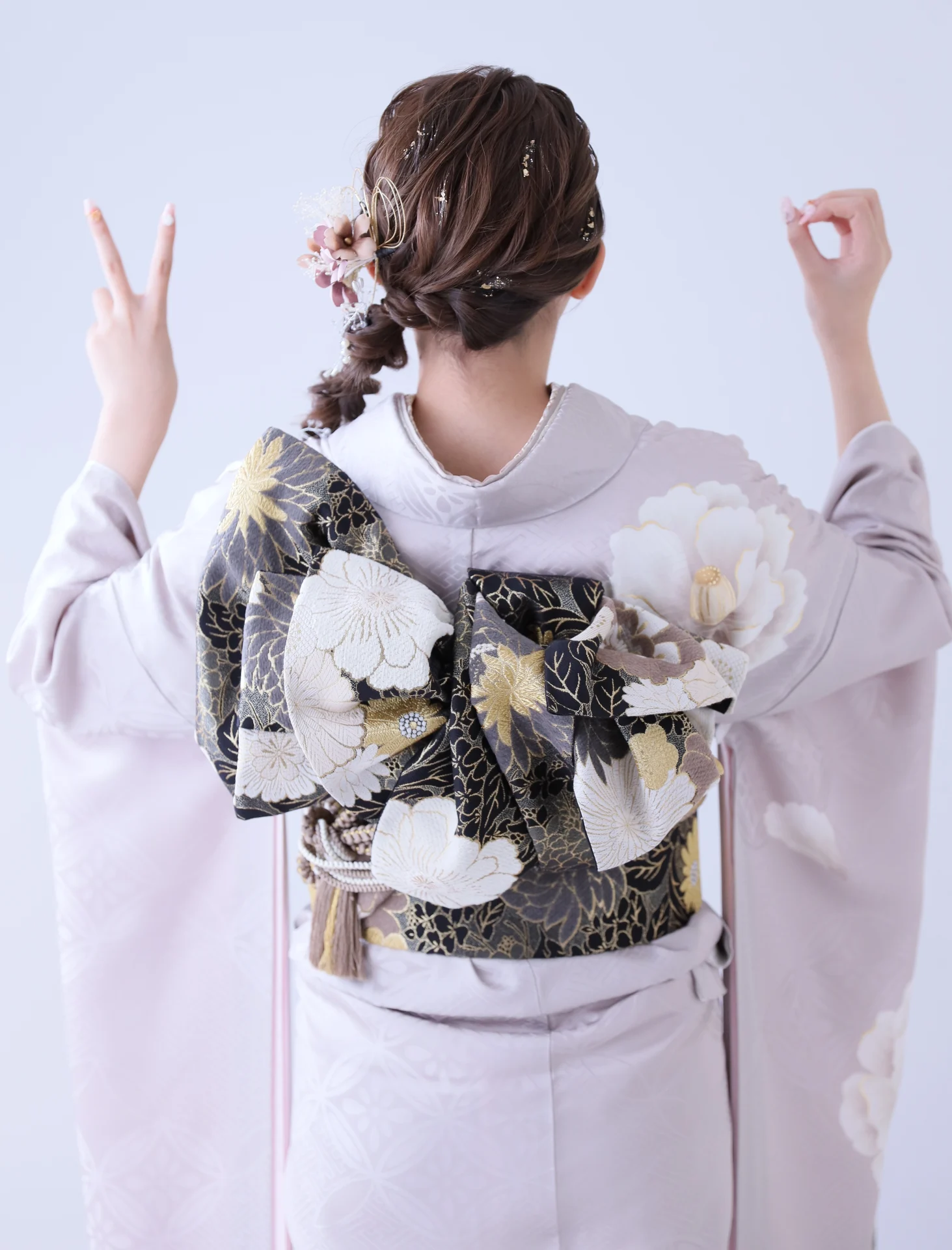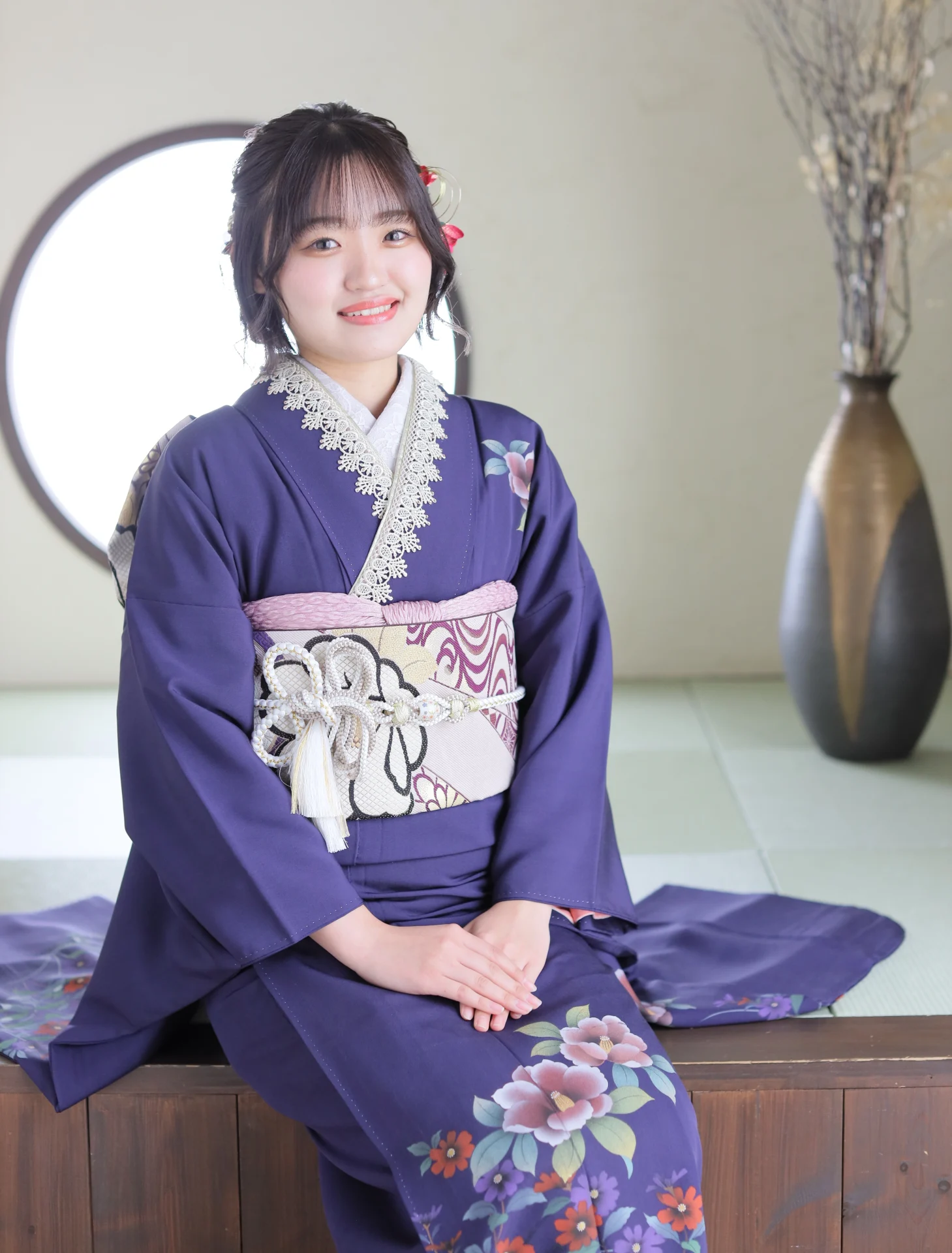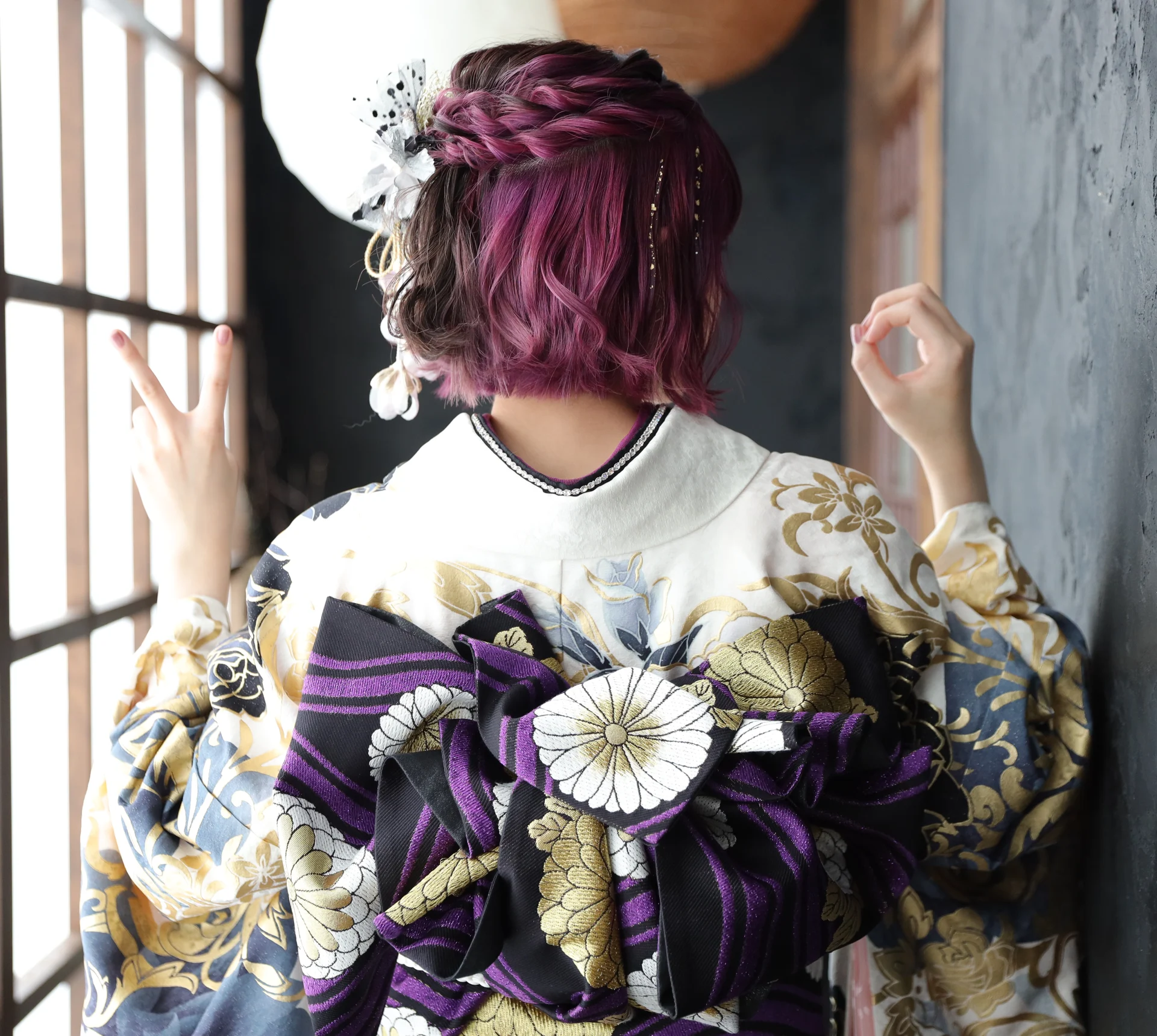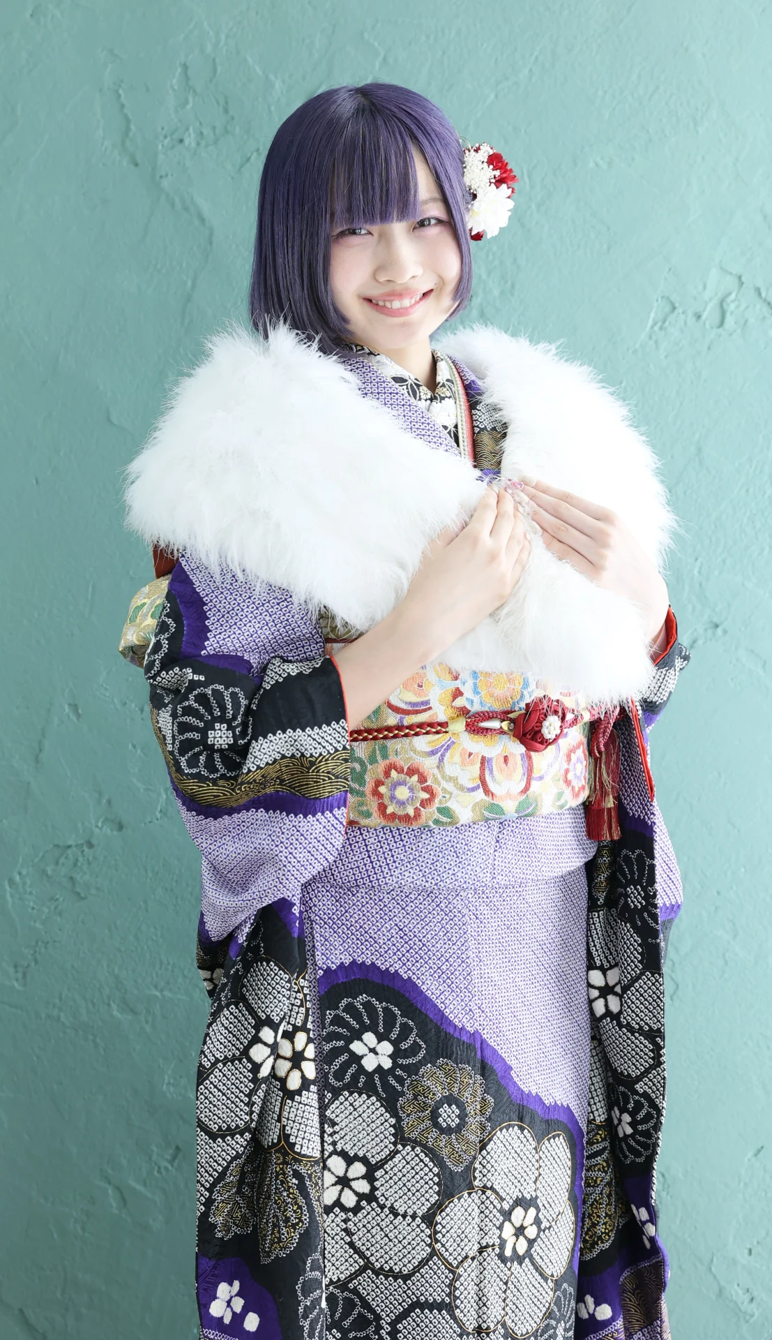 振袖は総絞りなのでパープルがきつくなく、そのためヘアカラーのアッシュパープルも際立って見えています!