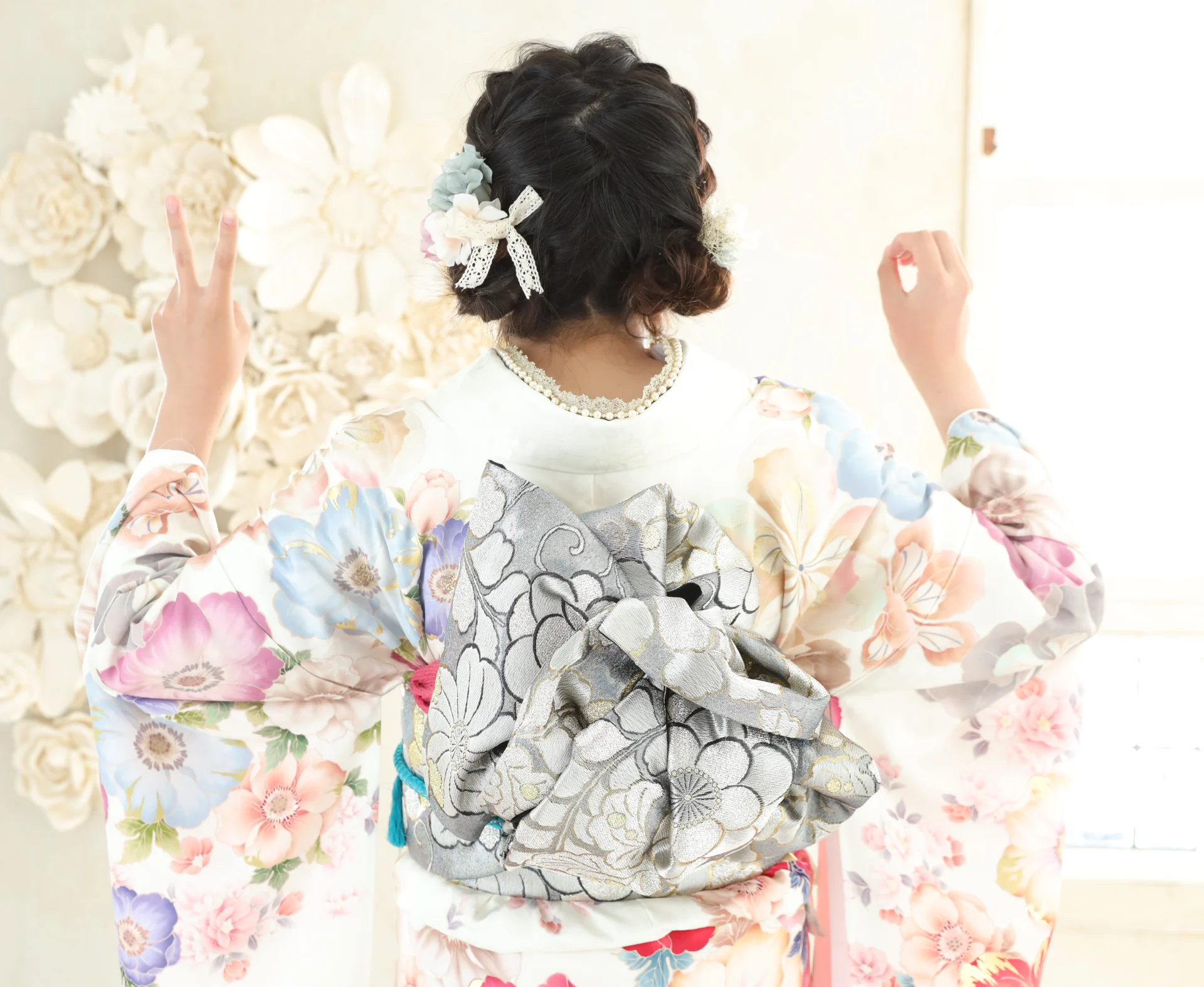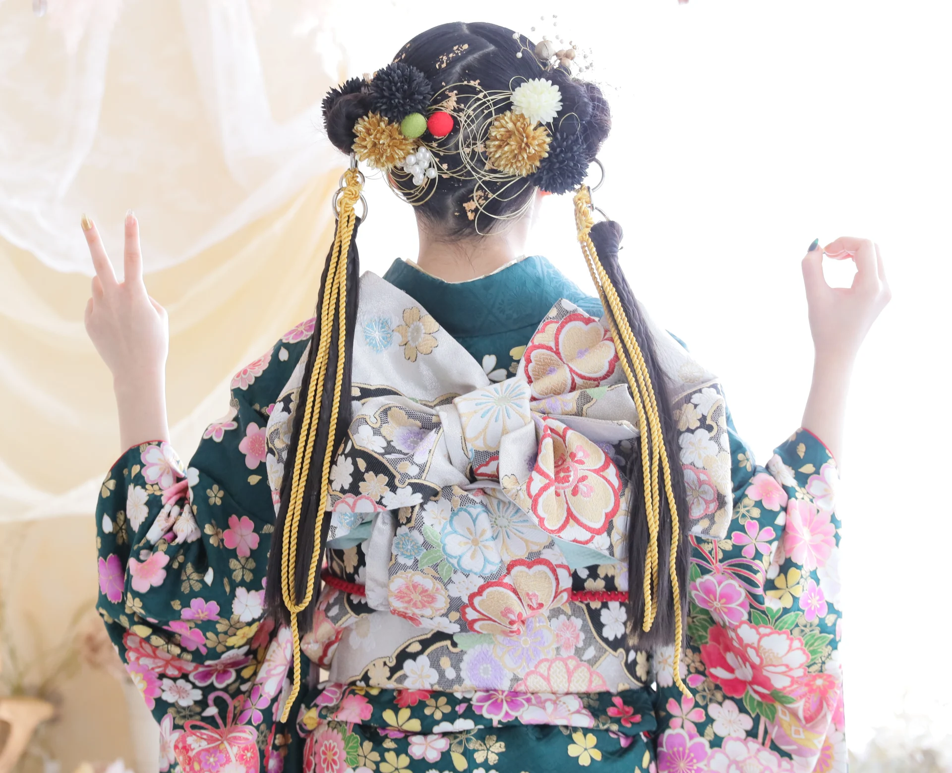 髪飾りの色は振袖の柄とリンクさせて、全体のコーディネートをまとめています!