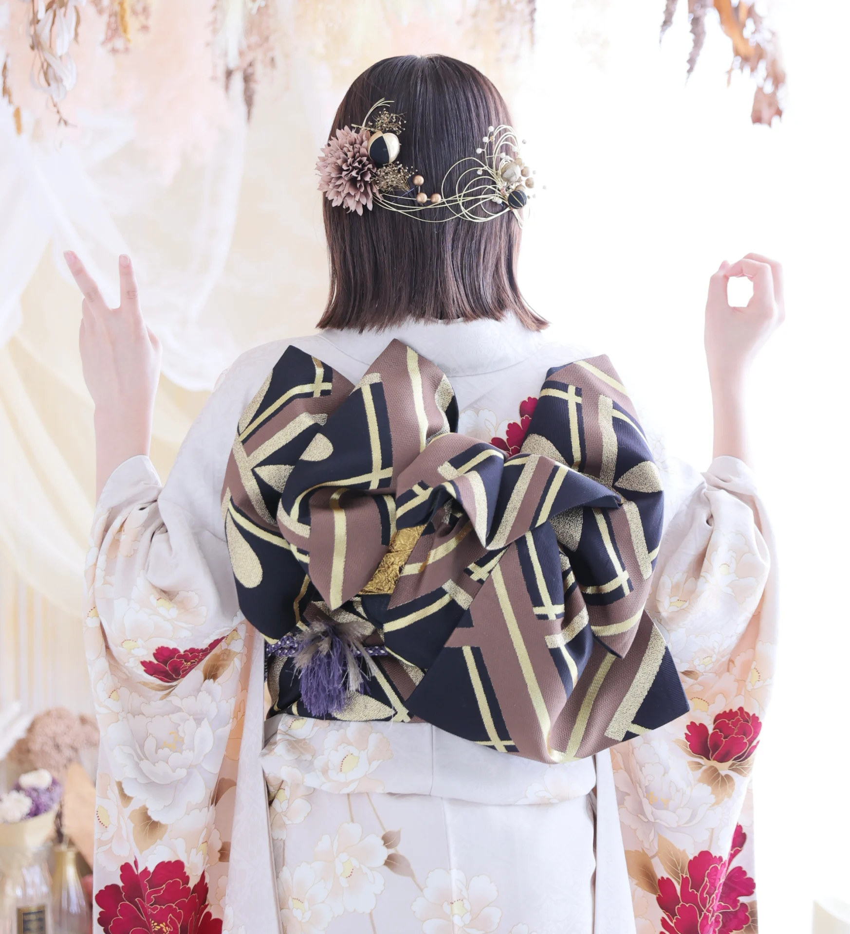 髪飾りは帯のデザインとリンクするように使っているので、統一感があって目を引きます!