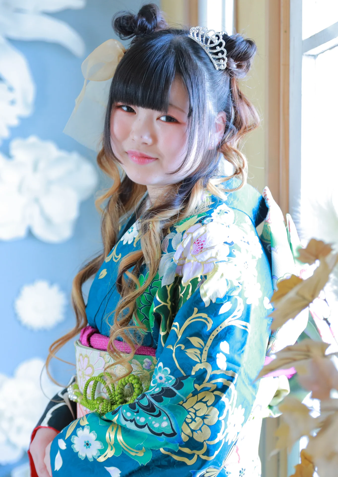 振袖の色と合わせたフルカラーのヘアスタイル。