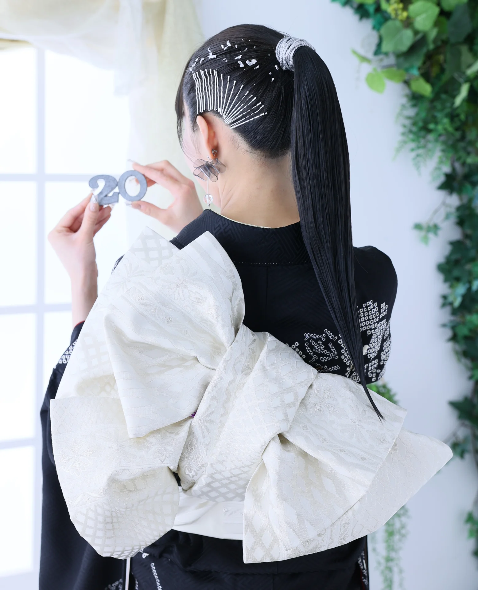 箔や紐はピンと同じシルバーでそろえて、ポニーテールそのものも引き立つようにしています。