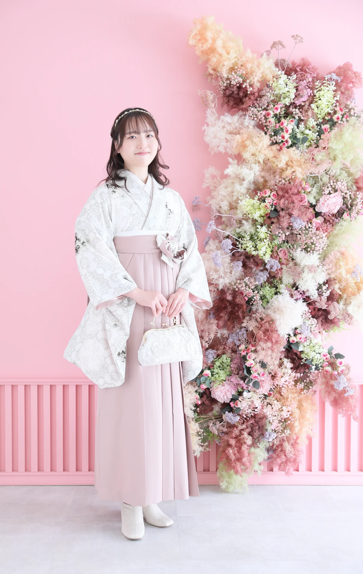 振袖の場合デザインによっては肩には柄の入っていないものもあり、その場合見えるのは袖の柄だけになるので、シンプルかつ印象的なイメージの袴姿になります!