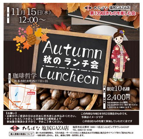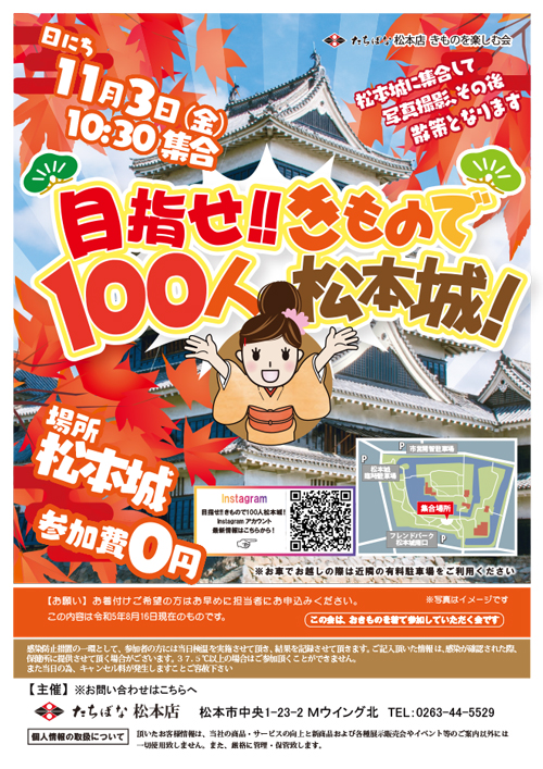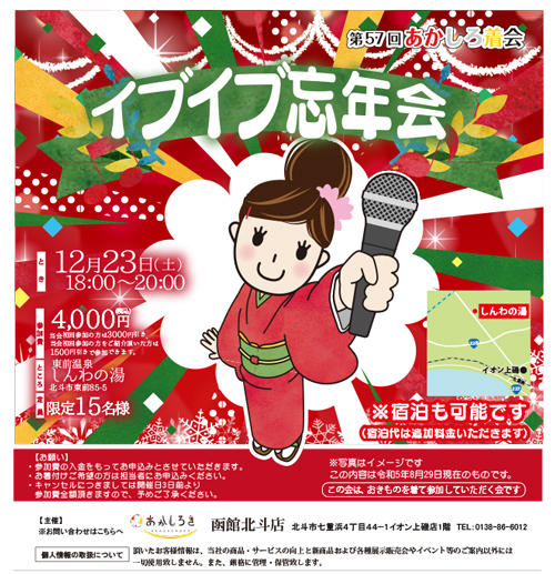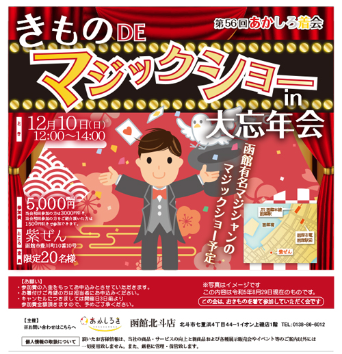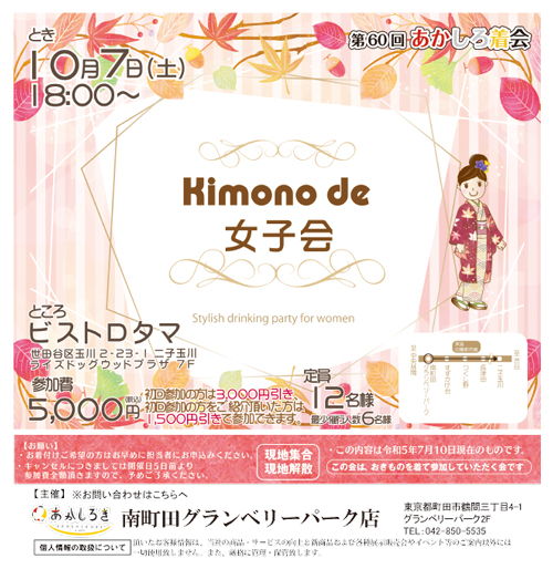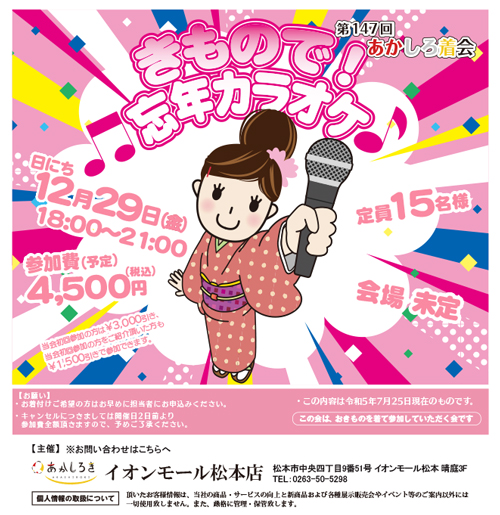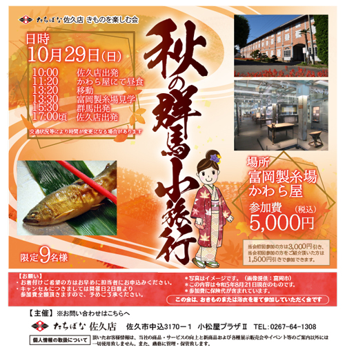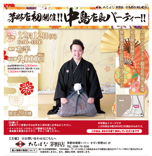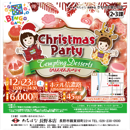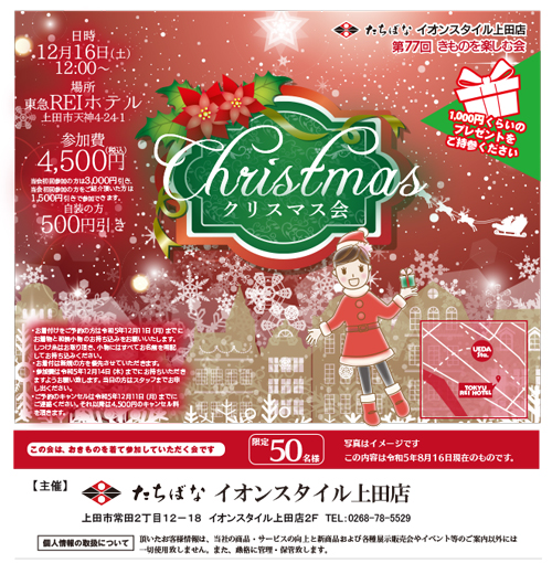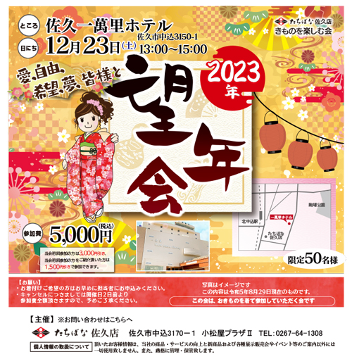 トップ> イベント>【12/23(土)】2023年 望年会 たちばな佐久店 【12/23(土)】2023年 望年会 #きものを楽しむ会 PDFはこちら 店舗名 たちばな佐久店 開催日時 12/23(土) イベント名 【佐久】2023年 望年会 開催場所 佐久一萬里ホテル 定員 50名様 参加費 5,000円(税込)