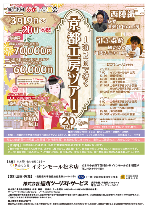 | イベント名 | 【イオン松本】1泊2日で行く 京都工房ツアー |