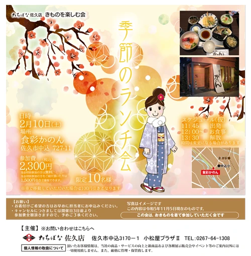 トップ> イベント>【2/10(土)】季節のランチ会 たちばな佐久店 【2/10(土)】季節のランチ会 #きものを楽しむ会 PDFはこちら 店舗名 たちばな佐久店 開催日時 2/10(土) イベント名 【佐久】季節のランチ会 開催場所 食彩 かのん 定員 10名様 参加費 2,300円(税込)