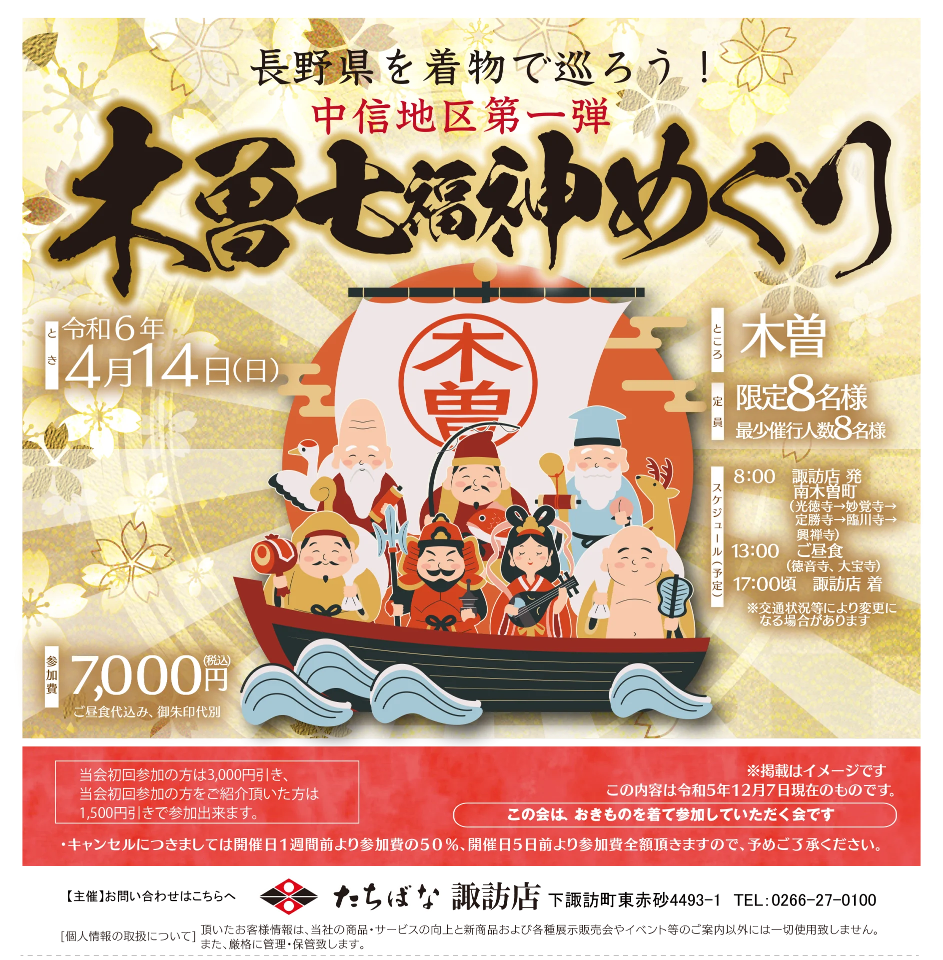 トップ> イベント>【4/14(日)】木曽七福神めぐり たちばな諏訪店 【4/14(日)】木曽七福神めぐり #きものを楽しむ会 PDFはこちら 店舗名 たちばな諏訪店 開催日時 4/14(日) イベント名 【諏訪】木曽七福神めぐり 開催場所 木曽 定員 8名様 参加費 7,000円(税込)