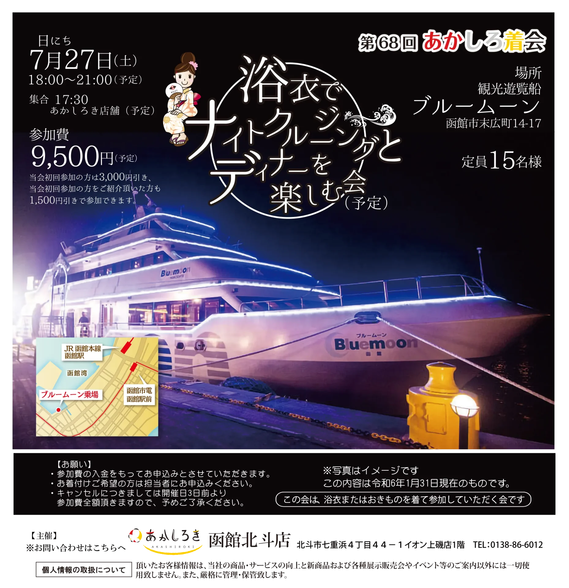 | イベント名 | 【函館】浴衣でナイトクルージングとディナーを楽しむ会 |