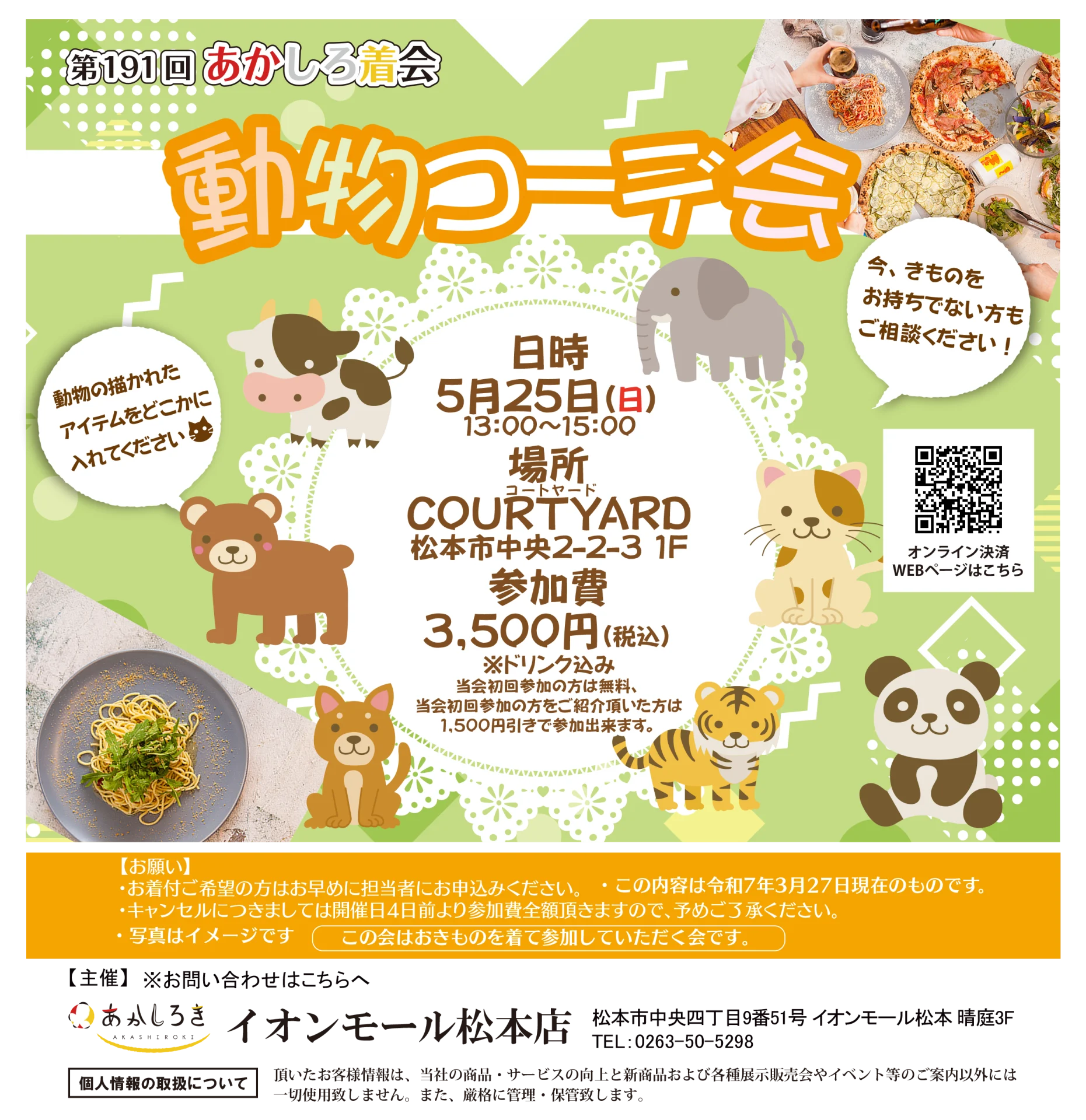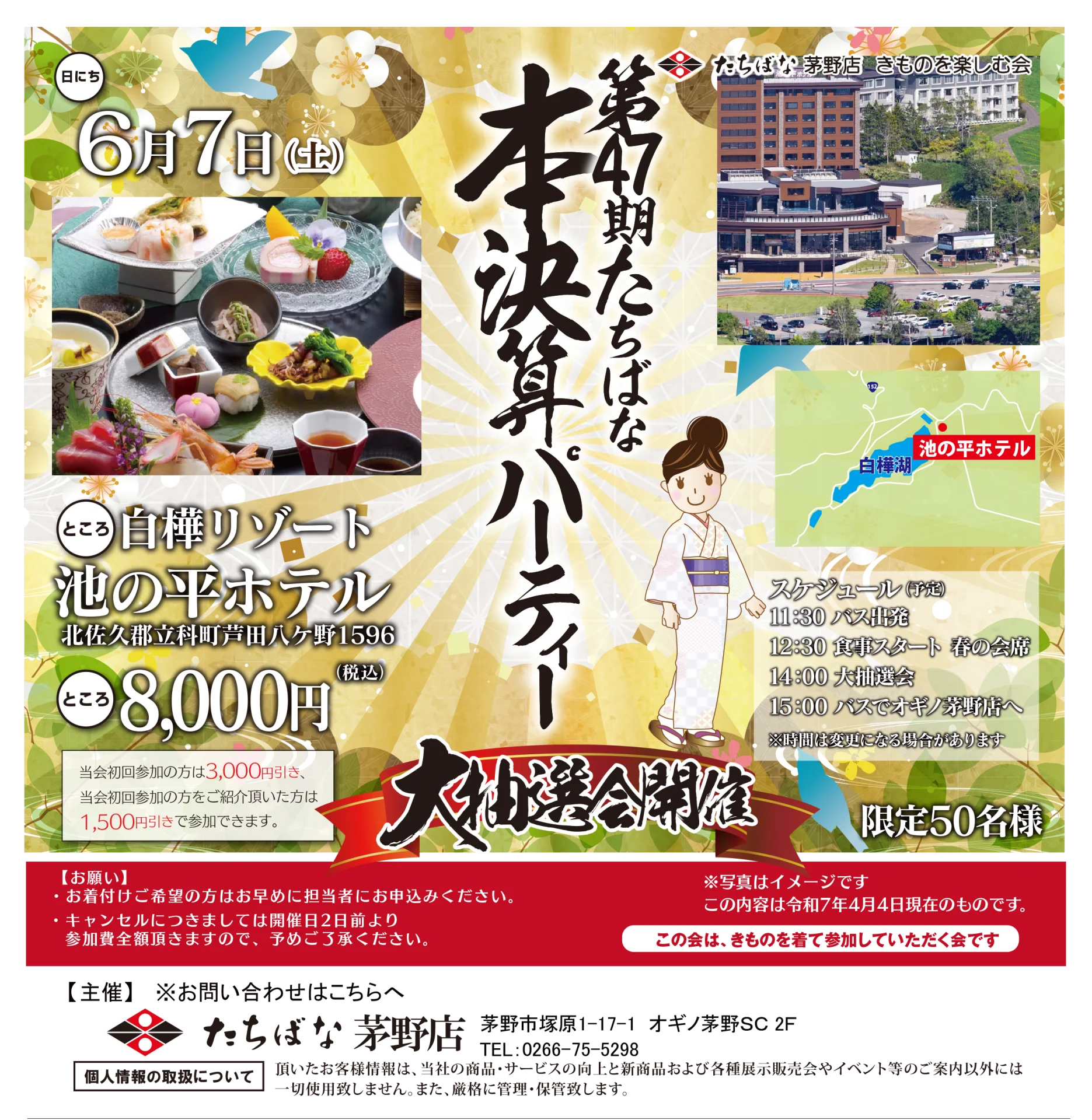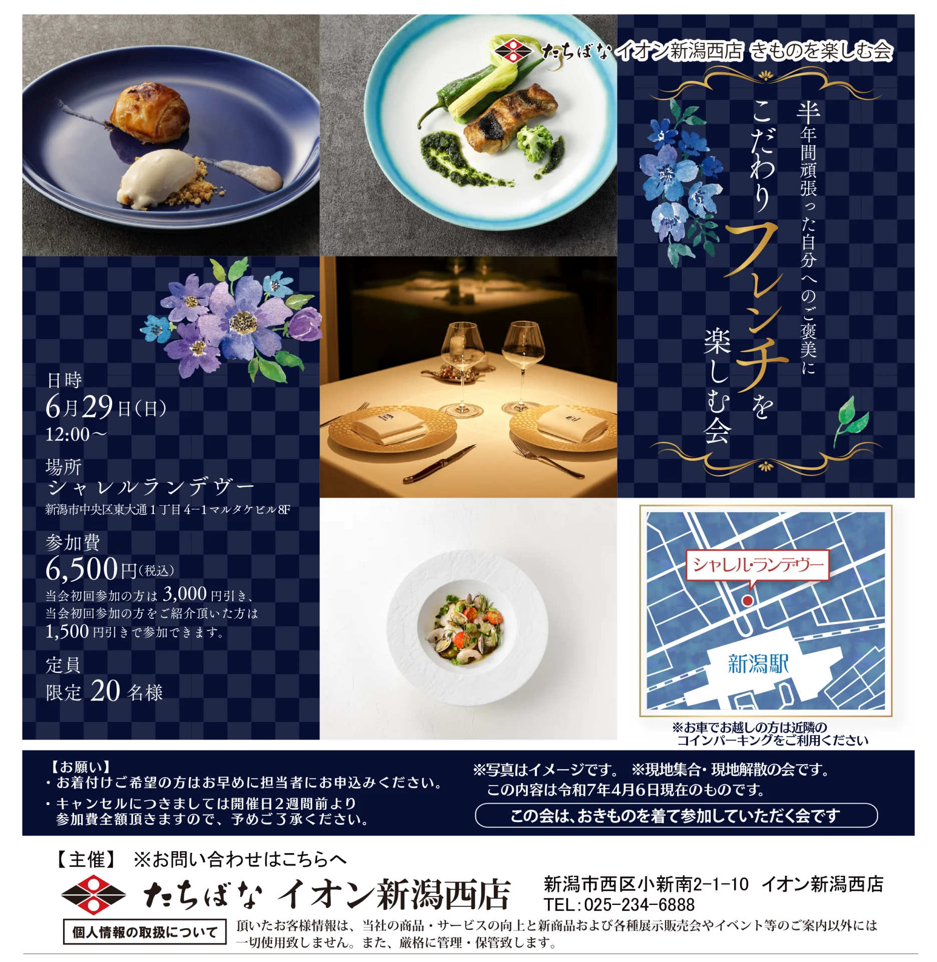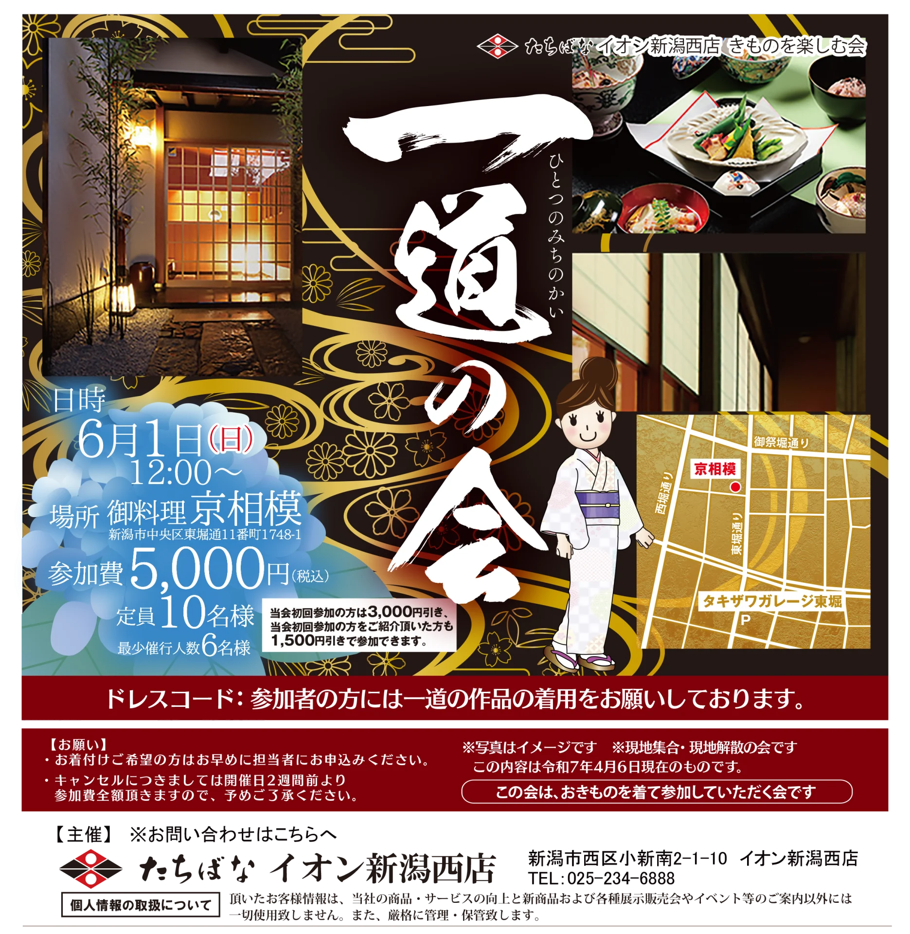 | その他 | ※この会は、お着物を着て参加していただく会です。 ※お着付をご希望の方はお早めに担当者にお申込みください。 ※キャンセルにつきましては開催日の11日前から10%、7日前から30%、前日から50%、当日100%かかります。予めご了承ください。 |