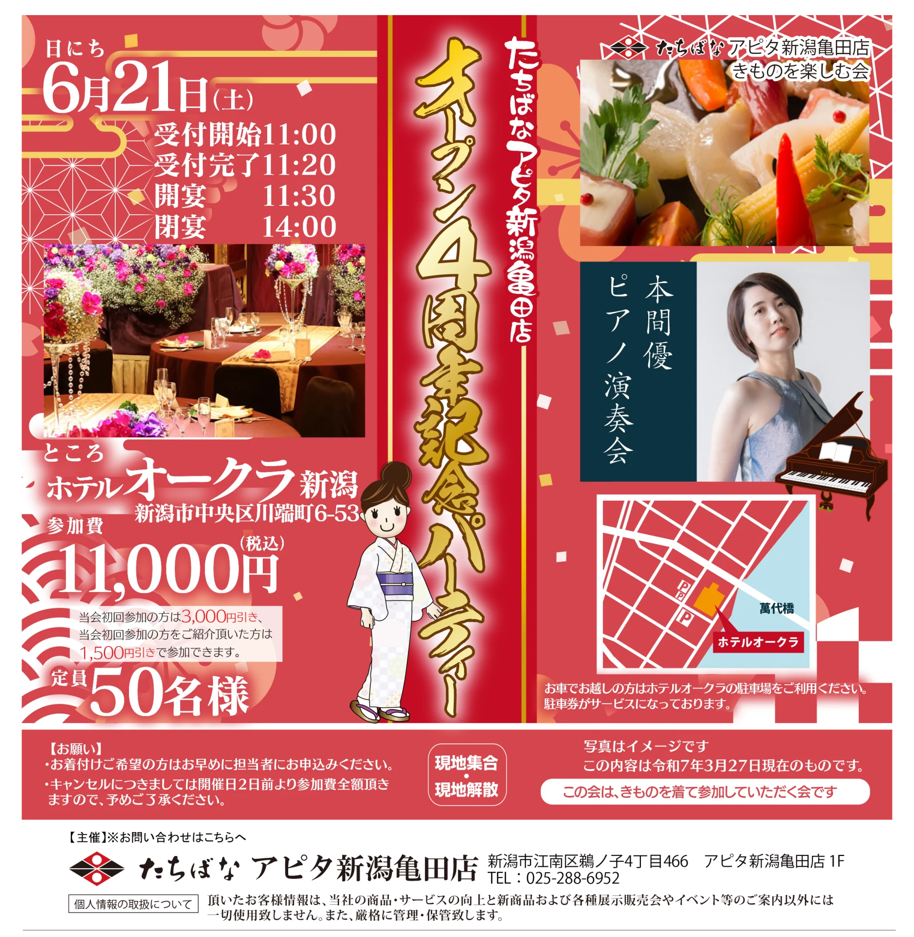 | 開催日時 | 3/29(土) スケジュール (予定) 11:05 東忠 集合 11:15 マナー講座開始 12:00 お食事開始 14:00 東忠 発 14:10 総合産業会館サンプラザにてお買い物タイム 14:40 サンプラザ 発 15:30頃 たちばな柏崎店 着 ※時間は前後する場合があります。 |