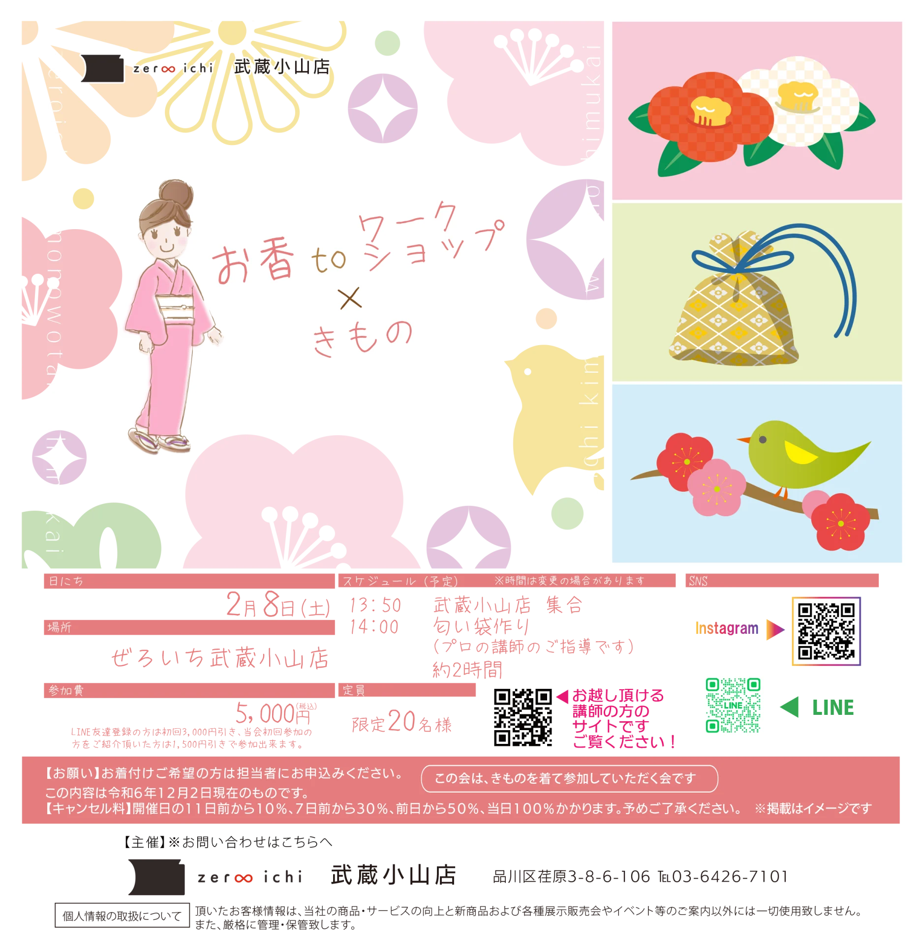 | 開催日時 | 2/8(土) スケジュール (予定) 13:50 武蔵小山店 集合 14:00 匂い袋作り 約2時間 (プロの講師のご指導です) |