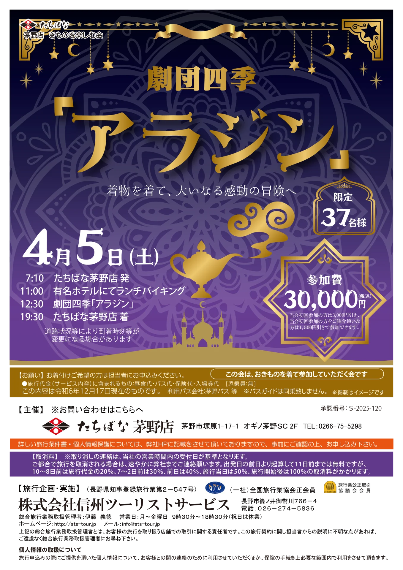 | 開催日時 | 4/5(土) スケジュール (予定) 7:10 たちばな茅野店 発 11:00 有名ホテルにてランチバイキング 12:30 劇団四季「アラジン」 19:30 たちばな茅野店 着 ※道路状況により到着時刻等が変更になる場合があります。 |