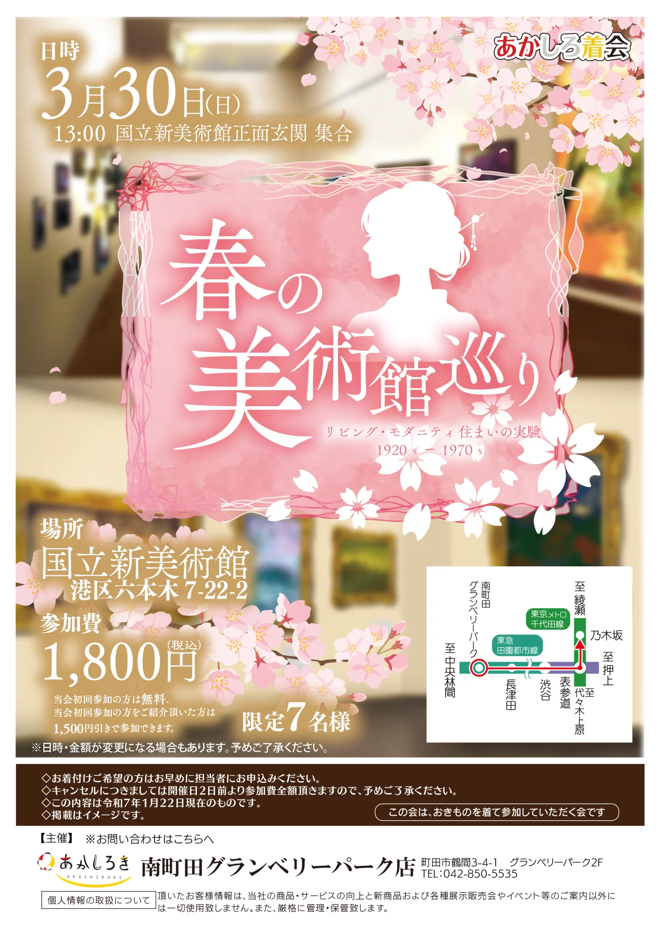| 開催日時 | 3/30(日) 13:00 国立新美術館証明玄関 集合 ※日時は変更になる場合があります。予めご了承ください。 |