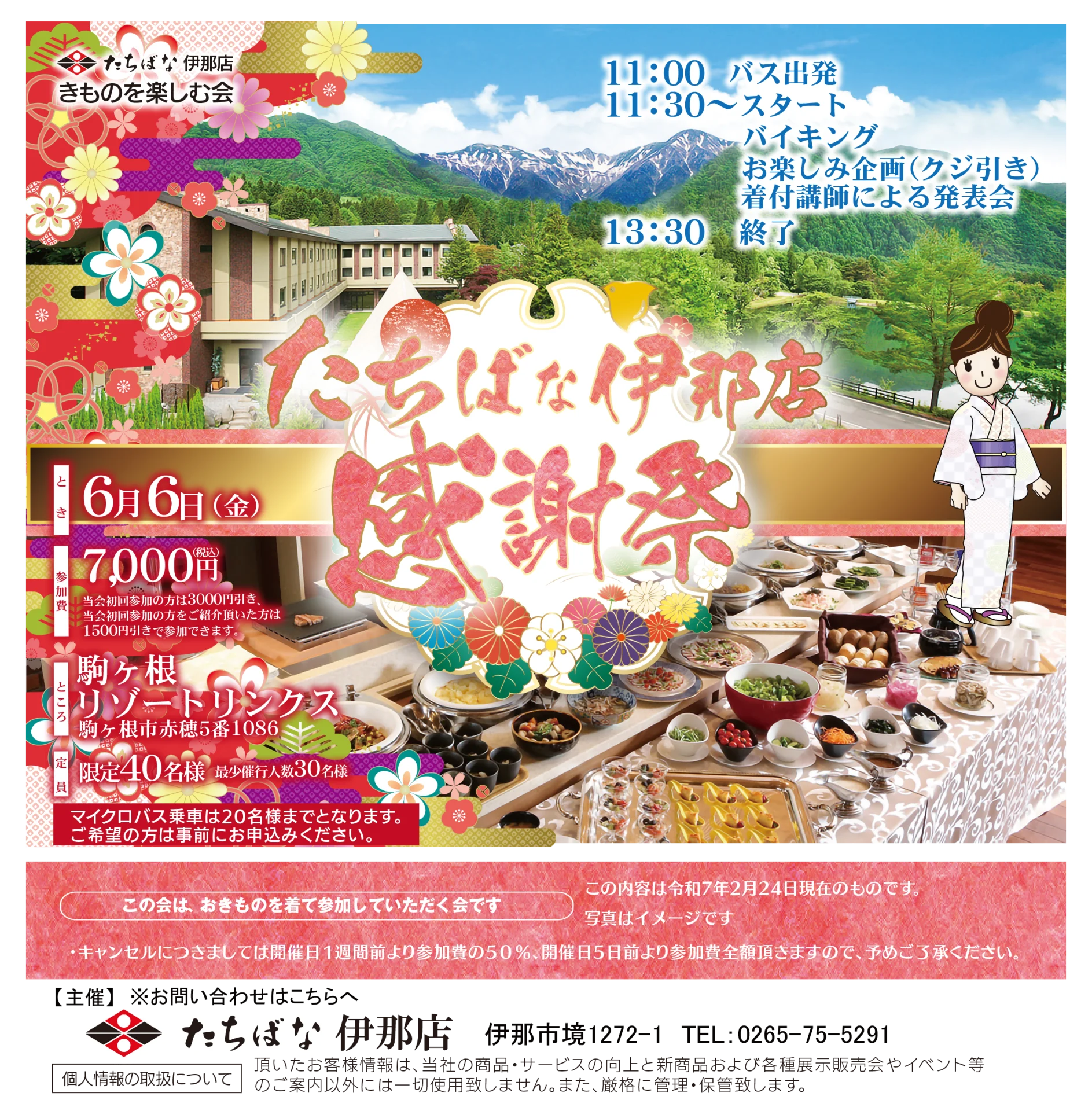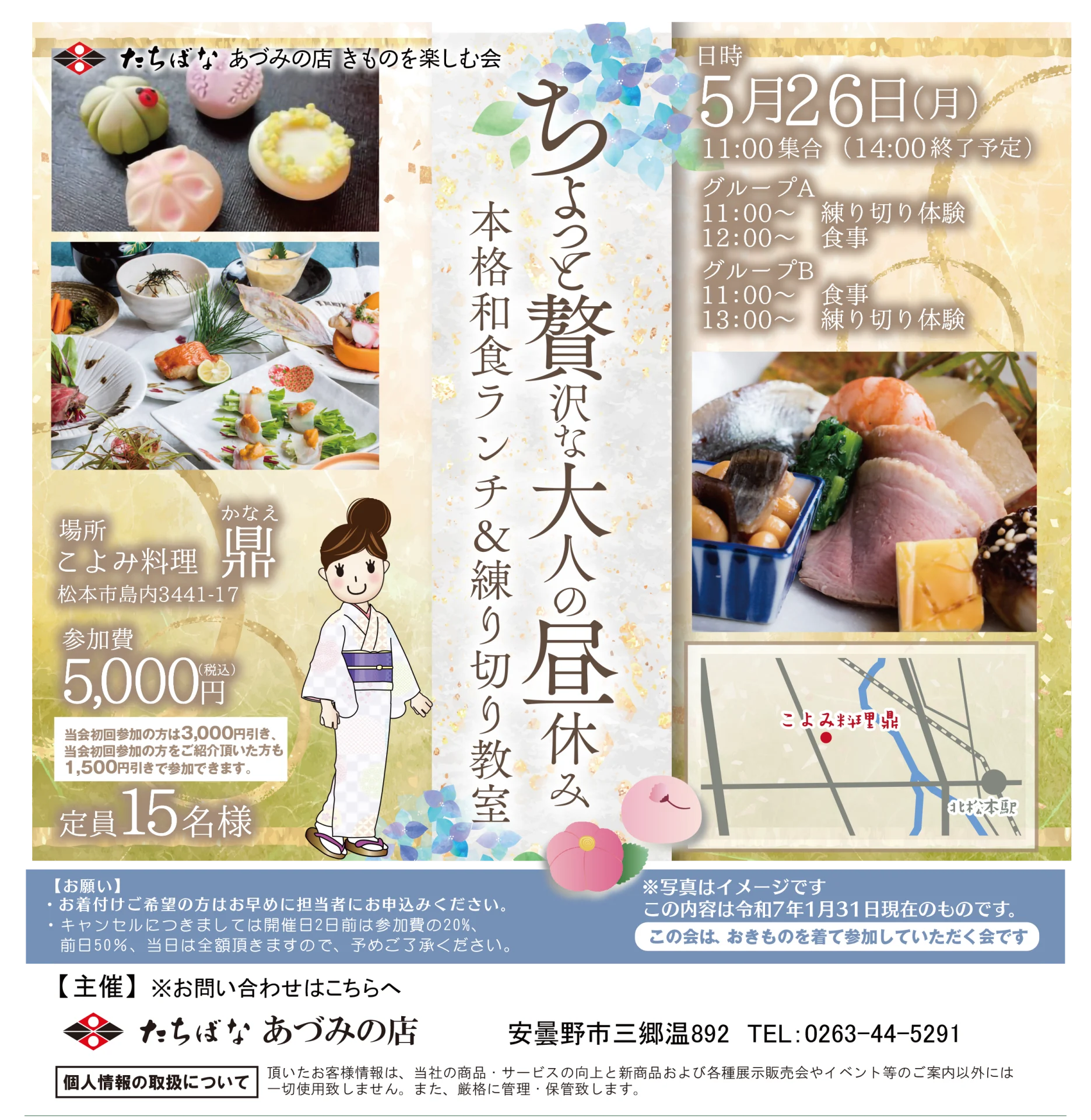 | 開催日時 | 5/31(土) スケジュール (予定) 9:30~ 着付スタート (塩尻着付教室) 11:30~ 移動 12:30~ 食事スタート 14:30~ 食事終了 ※時間は変更になる場合があります。 |