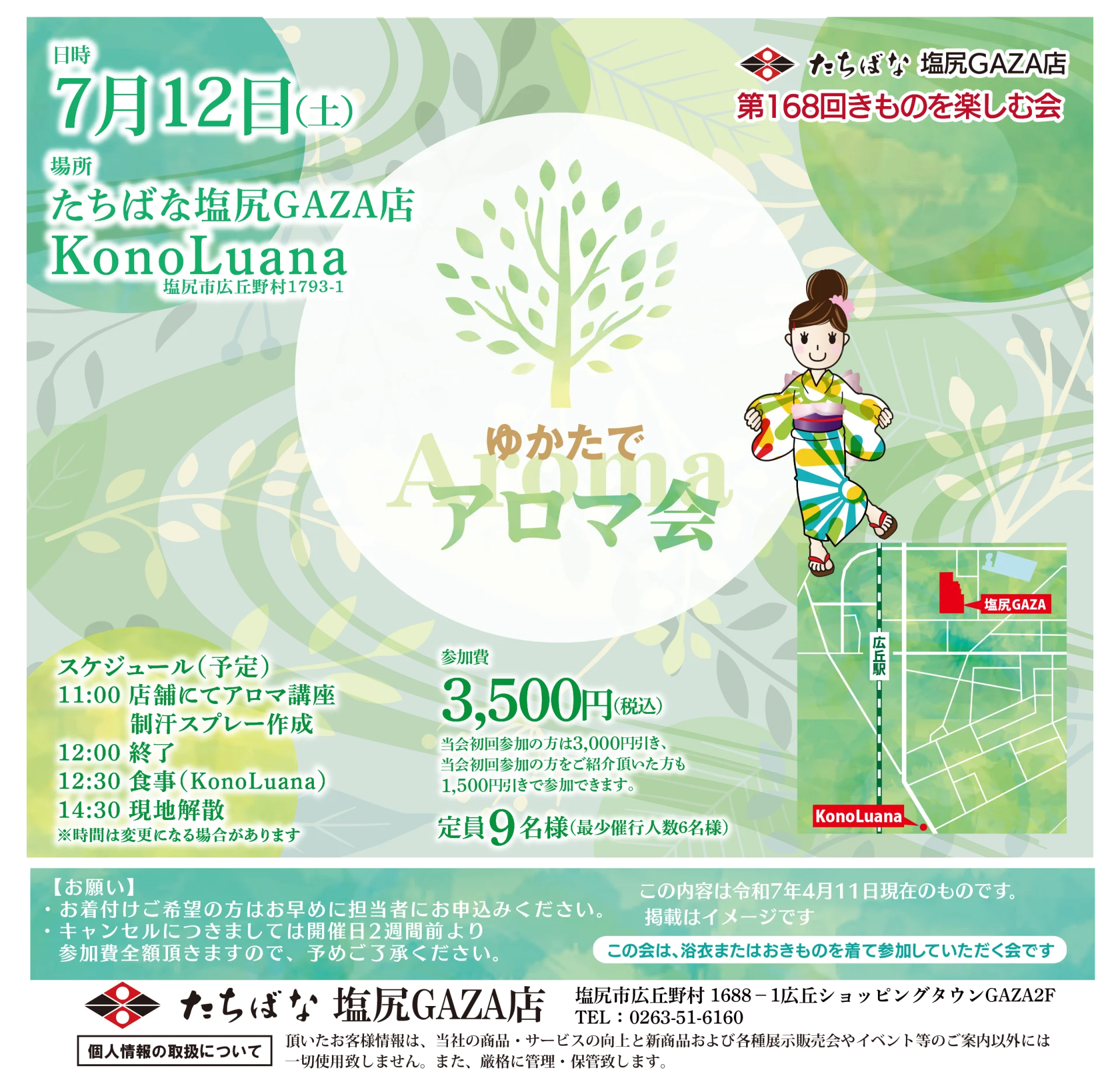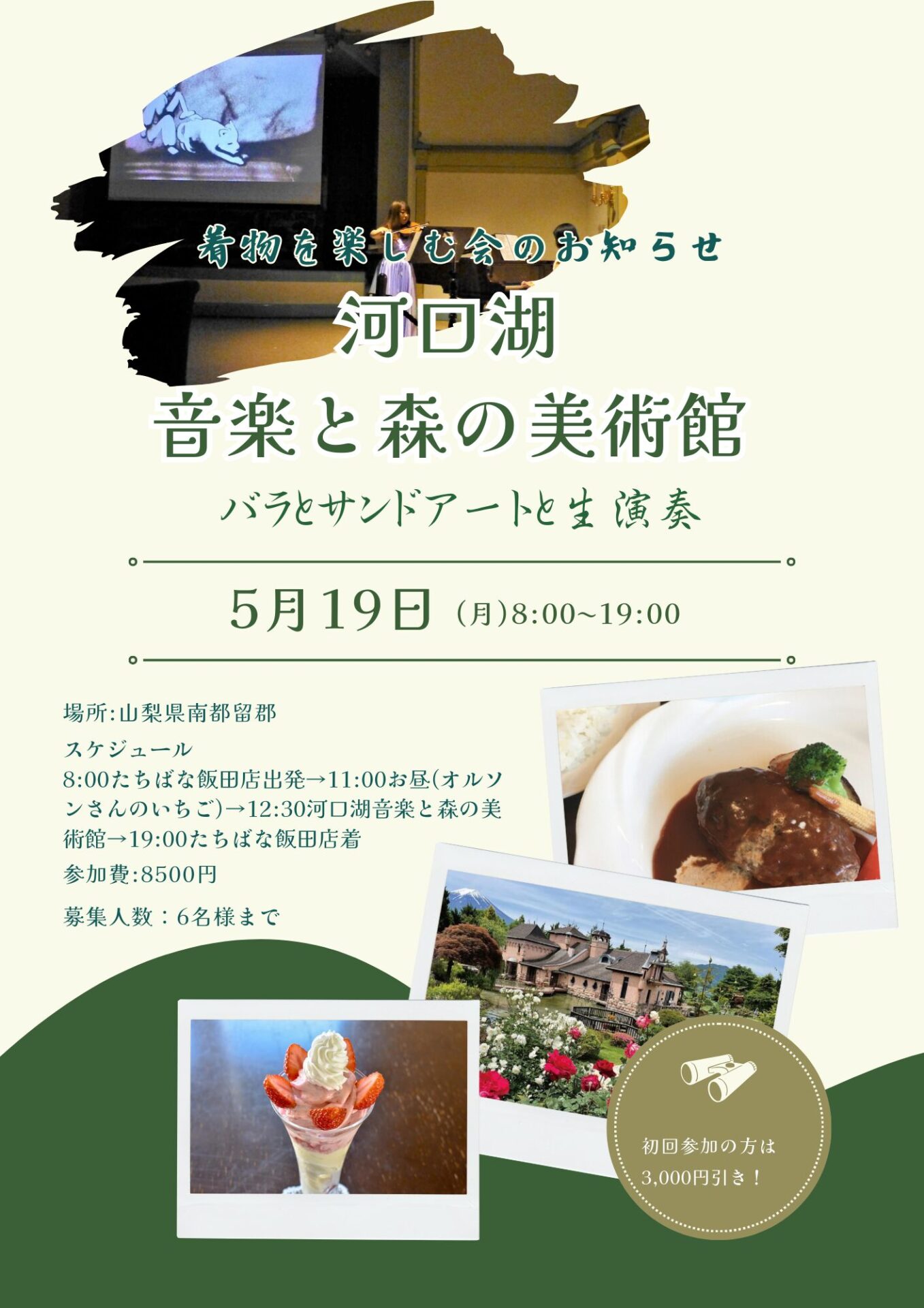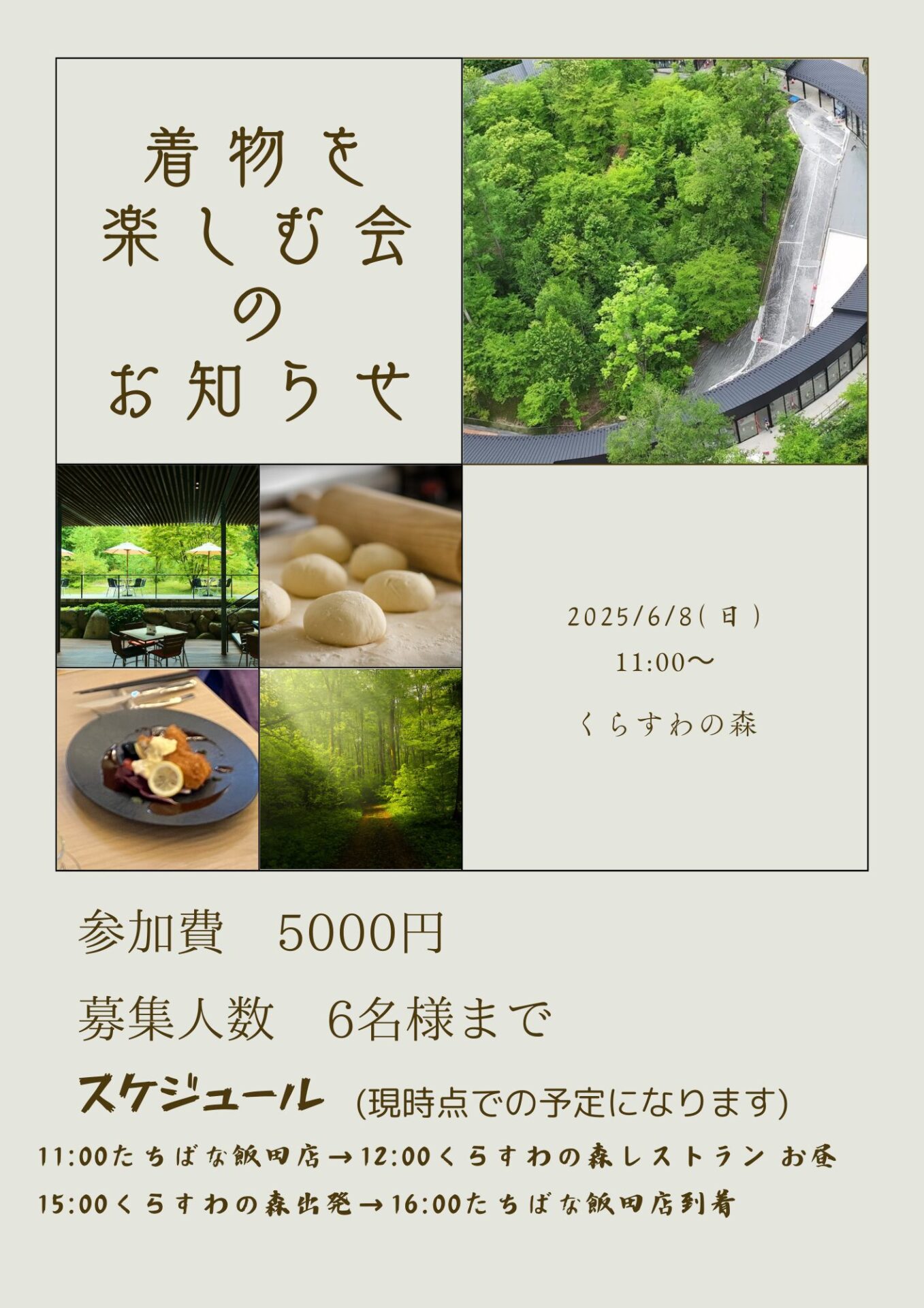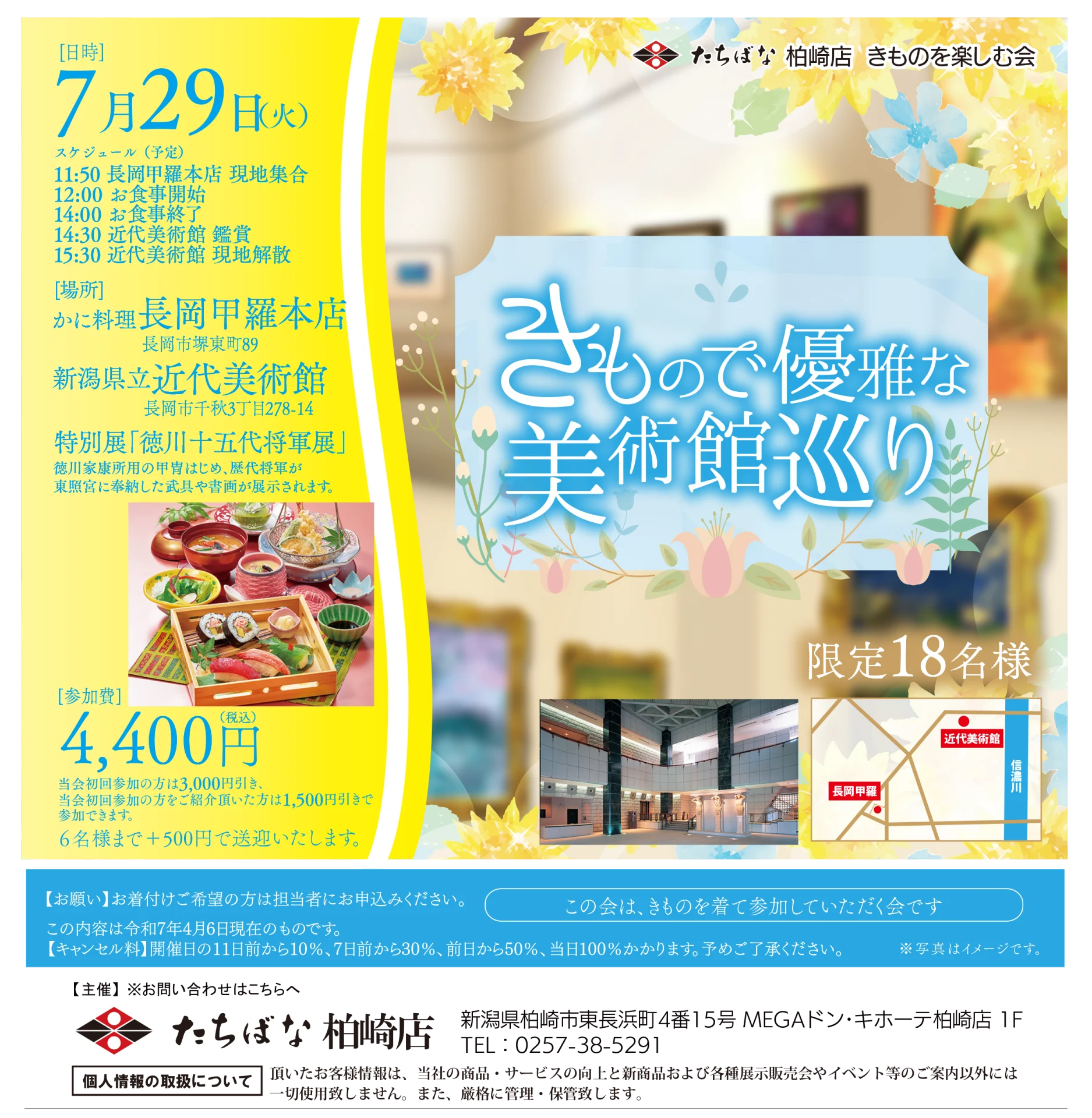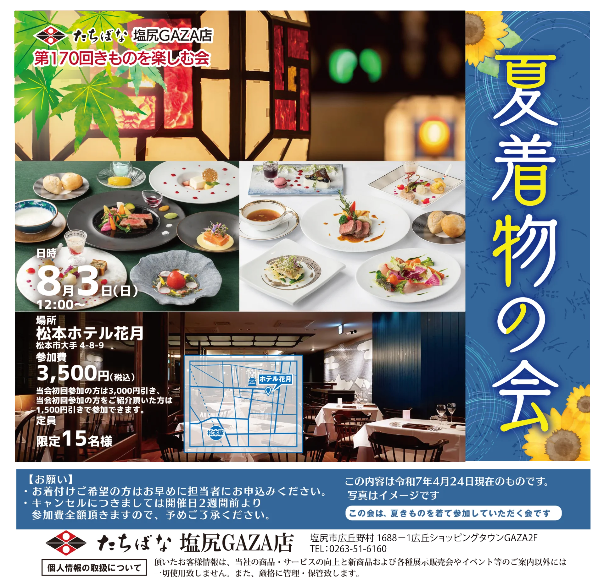 | その他 | ※この会は、夏きものを着て参加していただく会です。 ※お着付をご希望の方はお早めに担当者にお申込みください。 ※キャンセルにつきましては開催日2週間前より参加費全額頂きますので、予めご了承ください。 |
