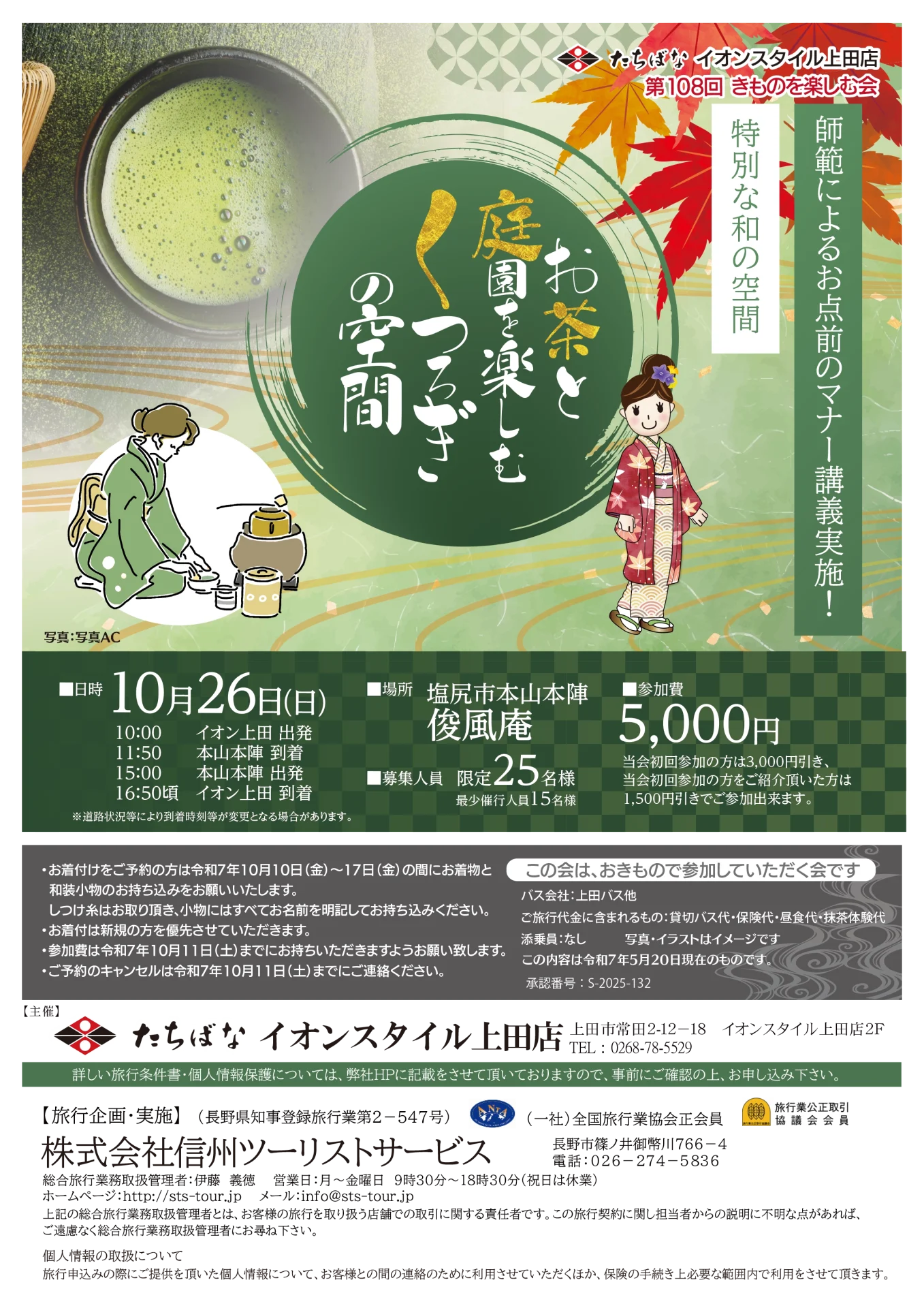 | その他 | ※この会は、お着物を着て参加していただく会です。 ※お着付をご希望の方はお早めに担当者にお申込みください。 ※キャンセルにつきましては開催日2週間前より参加費全額頂きますので、予めご了承ください。 |