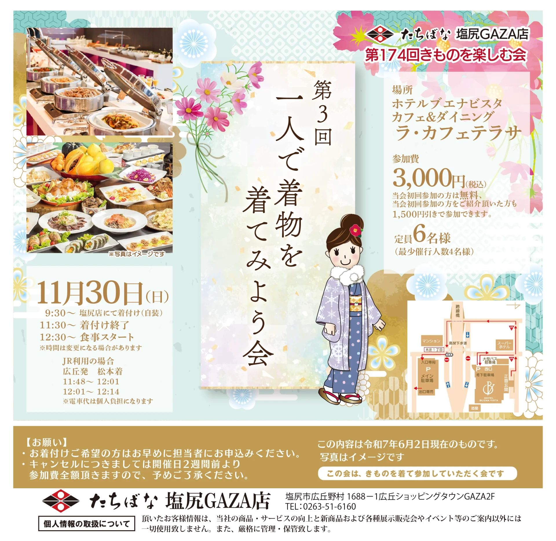 | 開催日時 | 11/30(日) スケジュール (予定) 9:30~ 塩尻店にて着付(自装) 11:30~ 着付終了 12:30~ 食事スタート ※時間は変更になる場合があります。 移動にJRご利用の場合 広丘発 松本着 11:48 ~ 12:01 12:01 ~ 12:14 ※電車代は個人負担になります。 |