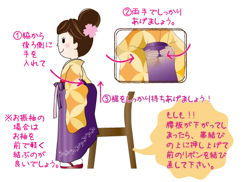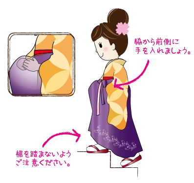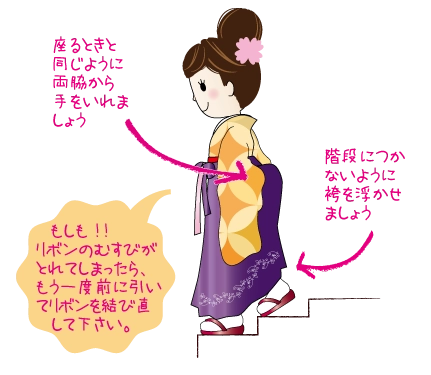 卒業式もこれで安心!袴のマナー 更新日:2026.01.18 カテゴリ―:振袖コラム 卒業式まであと少し!せっかくカワイイ袴姿で出席しても、もし着崩れしてしまったら悲しいですよね…着崩れしないために、袴を着ているときの所作を予習しておきましょう! ・階段の上り下りが不安…・椅子に座るときはどうしたらいいの?など、基本的な所作をお伝えします! 袴姿での座り方 袴の両脇から後ろに手を入れて、袴の後ろを持ち上げながら座ります。座った時、裾が床につかないように気を付けましょう。★注意★後ろを持ち上げずそのまま座ると自分の体重で裾が引っ張られて袴が下にさがり、着くずれしてしまうので注意しましょう。 袴姿での階段の上り方 袴の前が階段につかないように、袴の両脇から手をいれて前を浮かせながら階段を上ります。★注意★袴を浮かせずに階段を上がると前の裾を踏んでしまい、袴が引っ張られて着崩れしてしまいます。 袴姿での階段の下り方 袴の後ろが階段につかないように、両脇から手を入れてお尻のあたりで袴を浮かせながら階段を下ります。★注意★階段の上り下り、イスへの腰かけ時 等、袴が下に引っ張られたり、袴が汚れたりしやすいので、手でささえ注意しましょう。 卒業式で困らない為に!袴姿でのマナーまとめ いかがでしたか?当日困らないために、今から図を見ながら練習をしてみるのもよいかもしれませんねたちばな・シャレニーでは着付け後に軽くマナーもお伝えしておりますので安心です! 前の記事 前の記事を見る