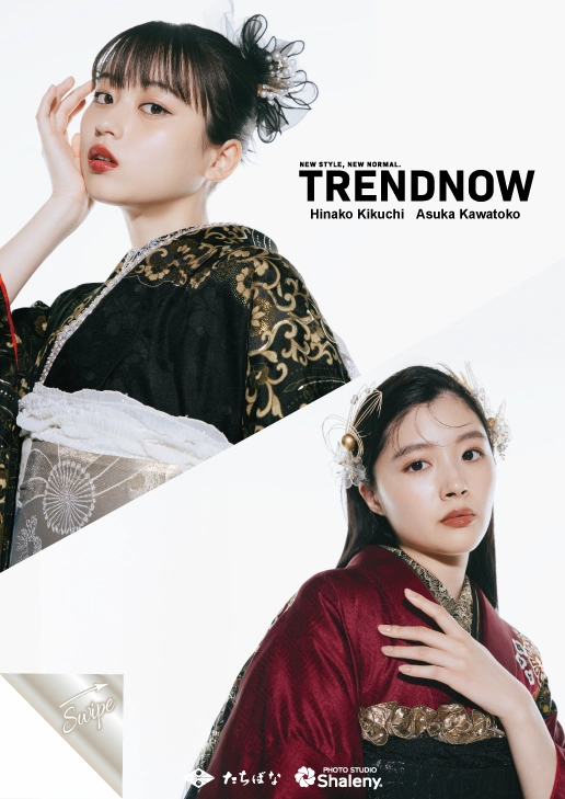 今っぽいモード感の中に上品さが滲み出る振袖ブランド【TRENDONOW(トレンドナウ)】。洗練された大人の可愛さ溢れる、川床明日香ちゃん&菊池日菜子ちゃんがモデルの振袖をご紹介!
