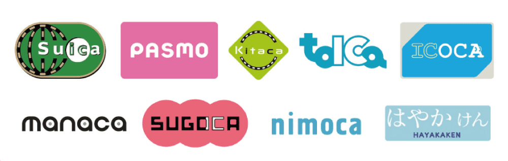<英語表記:Suica・PASMO・Kitaca・tolCa・ICOCA・mmanaca・SUGOCA・nimoca・HAYAKAKEN>