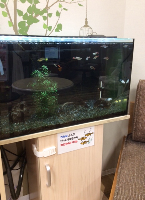 写真は当店自慢の熱帯魚です。社員が交代でお世話をしたり、水槽の掃除をしたりしてます。