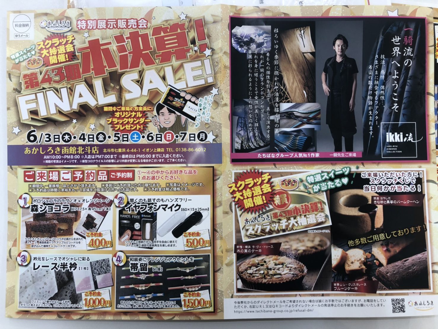 函館北斗店では6月3日から7日の5日間に第43期本決算ファイナルセールを開催します!たちばな人気NO.1作家、一騎流の斎藤一騎先生がご来場、スクラッチ抽選会、店頭小物20%OFFの決算限定豪華ラインナップ!そして来場者特典の記念品をご用意しております。ご予約の方限定ですのでご予約はお早めに!