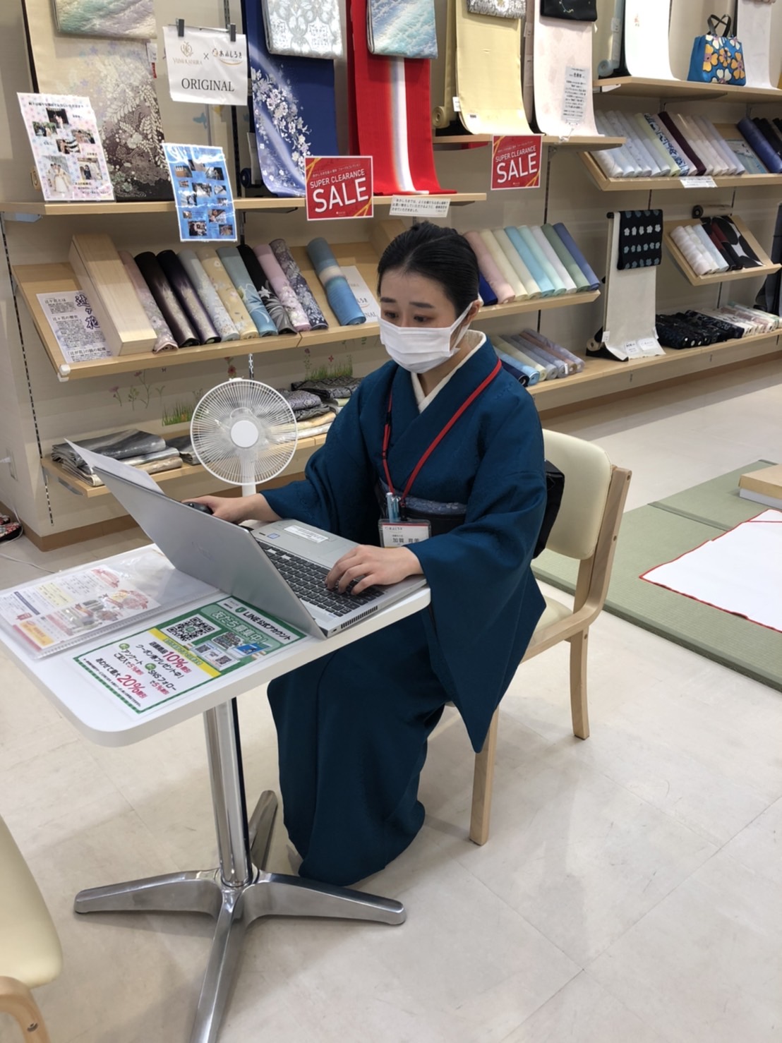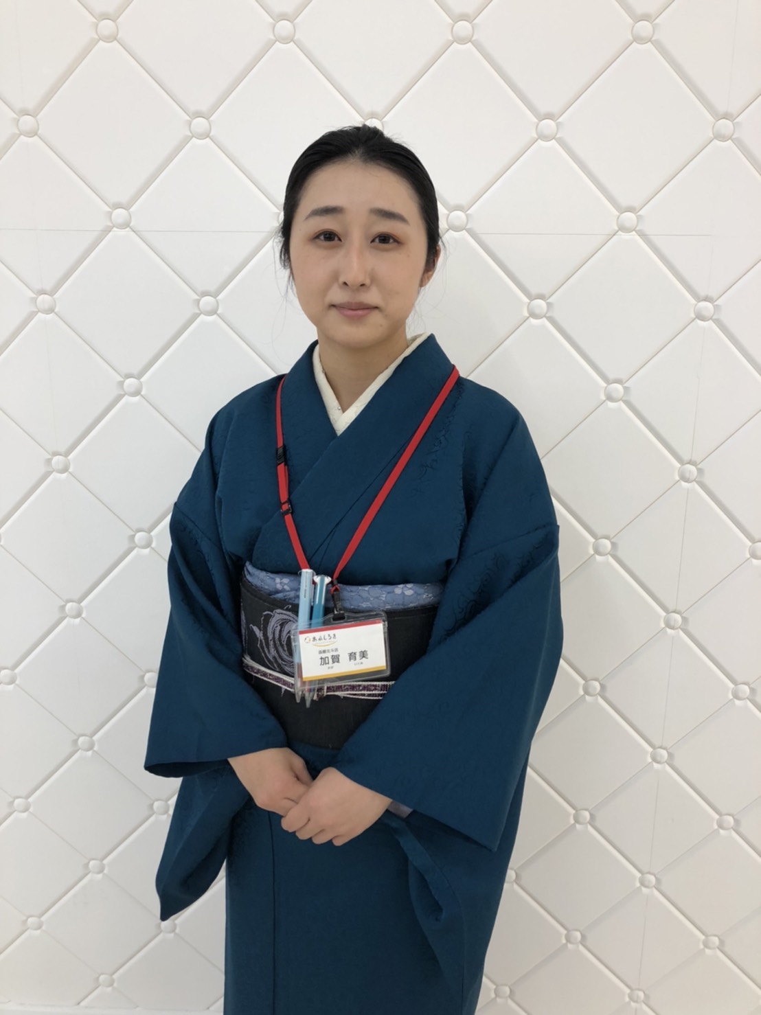 加賀さんは事務もしながら着付教室に通い、自装と他装を学んでいます。仕事にも真剣に取り組んでいただいております。