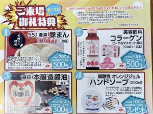 ご予約されますとお越し頂いたときに豚まん、コラーゲンドリンク、本醸造醬油、ハンドソープのご来場御礼特典があります。特に551蓬莱の豚まんが大人気です!