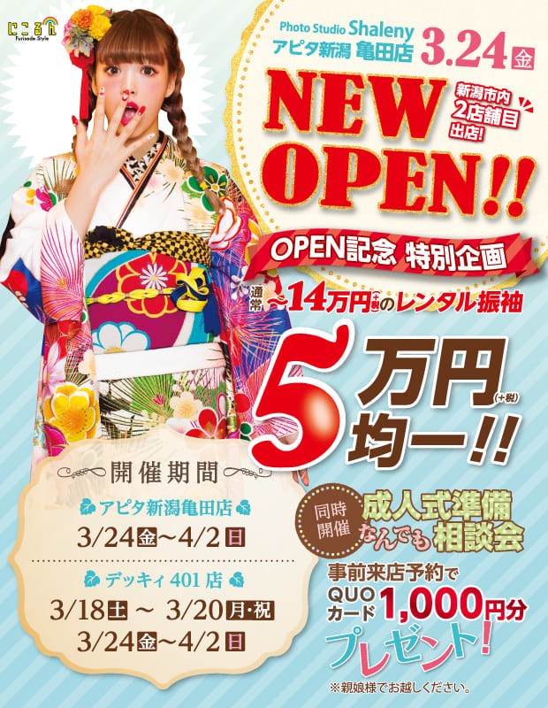 シャレニーアピタ新潟亀田店、シャレニーデッキィ401店の2店舗にて、オープン記念特別企画を同時開催中です。