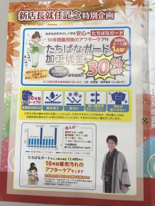 なんと!今回新店長就任記念でたちばなガード加工が30%オフになります。お一人様一点限りになりますがも他店でお求めの品も可能でございます。