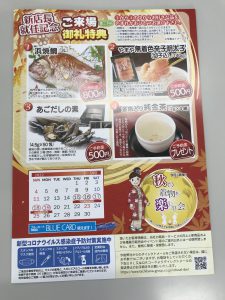 ご予約されますとお越しいただいた時に浜焼鯛、やまや無着色辛子明太子、あごだしの素、純金茶のご来場特典があります。