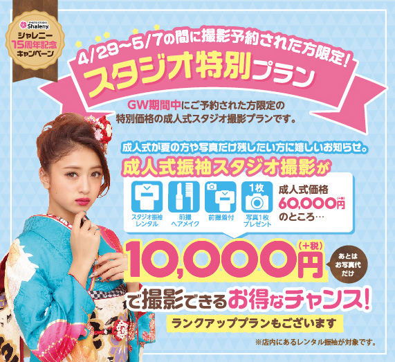 トップ> ニュース・リリース>GW限定! 特別振袖撮影スタジオプラン登場!! GW限定! 特別振袖撮影スタジオプラン登場!! 2017.04.29 #お知らせ 振袖の撮影予約はGWがチャンス!! 夏の成人式の方、成人式には出ない方にオススメ!振袖撮影プランがGW限定で特別プランが登場です。 お写真だけ記念に残したいと思っている方はこのお得なチャンスをお見逃しなく! 詳しい撮影内容はコチラからご確認ください。 シャレニーのご予約はコチラからどうぞ! たくさんのご来店お待ちしております! お気軽にお越しください♪ Inquiry お問い合わせ 当社のサービスや商品に関することはもちろん、お着付や・お手入れ・きものの素朴な疑問やわからないことなど、お気軽にお問い合わせください DM発送停止 よくある質問 クーリングオフについて 積立カードについて お問い合わせフォーム