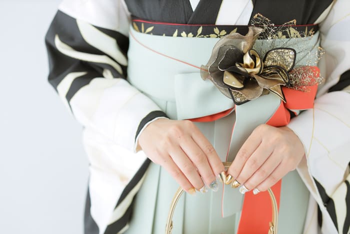 帯やバッグ・草履・髪飾りなどと色を合わせたり、着物や袴から色を拾って合わせる選び方をするとまとまったコーディネートに見えます。