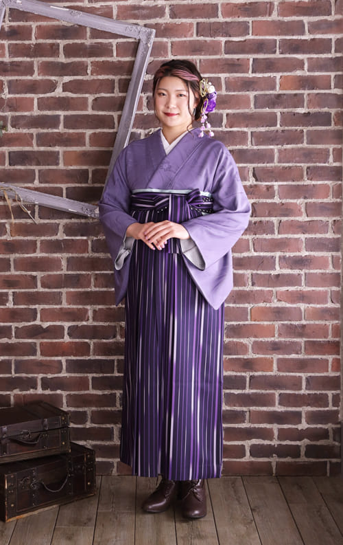 着物・袴・髪飾りを紫色でまとめ、ヘアもポイントカラーを紫に!