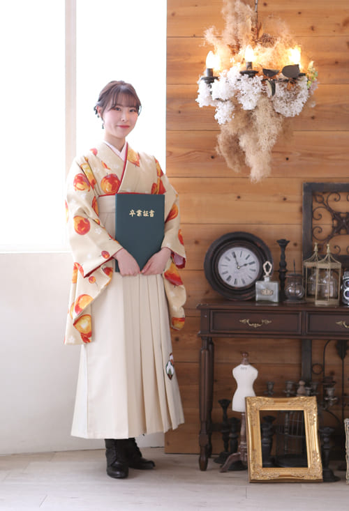 袴は小振袖のベージュと同系色のクリーム色で合わせ、重ね衿・帯はリンゴの赤色を拾ってコーディネートしています。
