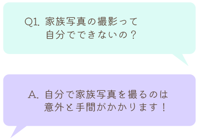 Q1でもお伝えしたように、家族全員が写った写真を撮るにはカメラマンか三脚などを準備しなければなりませんし、自撮りで行うには限界があります。