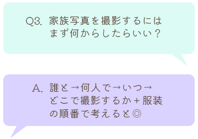 家族写真を撮りたいと思っても何からしたらいいのかわからない場合は、まず「誰と一緒に写真を撮るのか」から順番に考えていきましょう。