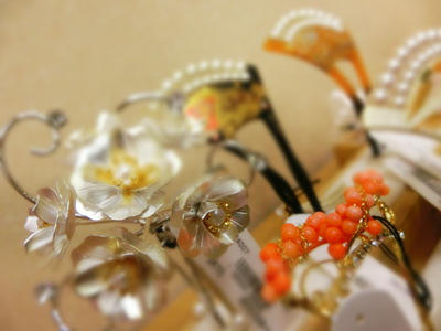 綺麗な髪飾り☆サンゴ調の色使いや、角度の変化をつけることのできる画期的なヘアアクセもご用意しております!