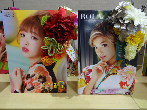 藤田ニコルとローラが振袖のパンフレット撮影の時に付けていた髪飾りと同じ形のものが本店には現在15点ございます。
