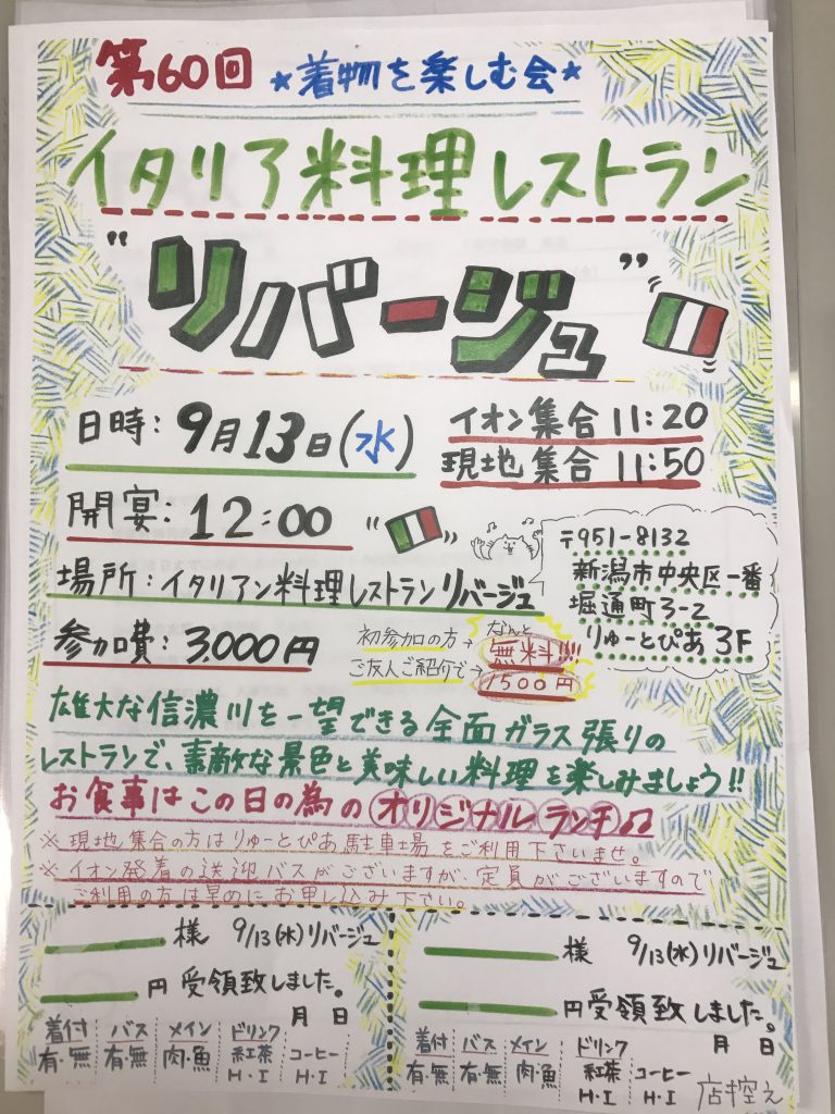 9/13にりゅーとぴあの3Fにありますイタリア料理リバージュで単衣の会を行います!