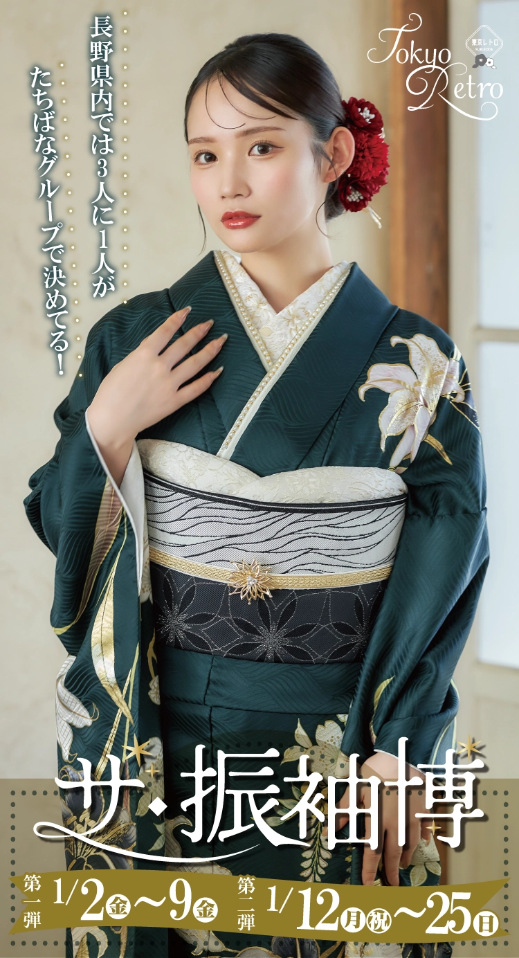 伊那市で開催|地域No.1振袖取扱店舗が主催の振袖イベント|流行柄や古典柄など豊富な品揃え|レンタルや購入などあなたにぴったりの振袖選びができる|レトロモダンのご紹介