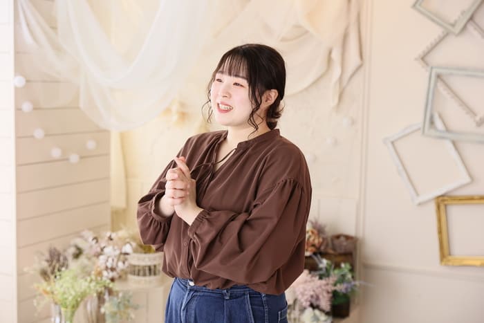 【自分の将来を楽しみに思いたい】と思ったからです。とにかく「人のためになるお仕事がしたい」とは思っていたので、介護職を始め、色々な職業を視野に入れて就職活動をしていました。たちばなの説明会は、リクルートサイトでオススメ欄に出てきたから、ポチッとエントリーしただけ。元から知っている企業ではありませんでした。最初の説明会に参加した時には、「写真を撮るのが好き」という気持ちを、採用グループの方へ、ありのままに語っているだけでしたが、選考を進めるごとに、「カメラマンを仕事している自分」を楽しみに思えるように。最終選考は会長とお話させていただきました。面接後、会長も私に対して「楽しい」という感想を寄せてくださったことを、採用グループの担当の方から伺いました。「これがマッチか!!」と言うのが率直な感想です。企業も自分も、「羽沢舞」という人間を楽しみに感じれるというのは本当にご縁だなと感じました。