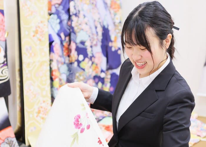 この業界に入るまでは母の着物を見たり、着用したりするだけだったので知識に関しては全くと言っていいほどありませんでした。着物も多くの知識がありTPOなども覚えることが非常に多くありました。働くうちに次々と聞こえてくる新しい単語に私自身の記憶力がついていかず非常に焦っておりました。しかし現場の先輩方がその都度説明をしてくださったり、着物の先生が教えてくださることによって徐々に理解して、覚えていくことができました。また新人教育も充実しているため、わからないことは質問して解決をすることができました。まだまだ知らない知識などもあると思いますが、また着物について新たなことが知れると考えるととてもワクワクします。着物に携わりお客様にその魅力を自分の言葉でお伝えすることができると、やりがいに繋がっていきます!
