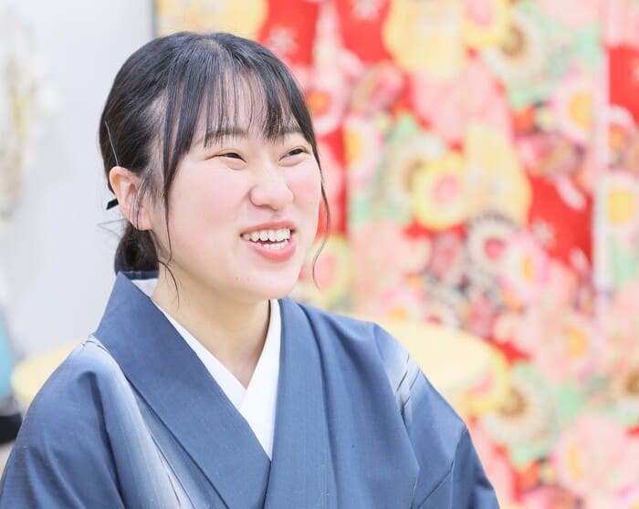 入社のきっかけは私の母の影響です。私の母は着物が好きで、私にも着物を着せてくれていました。私が成人を迎えた際も母は着物を着て一緒に写真を撮ってくれました。着物が身近にあったので呉服業界に興味を持ちました。そして弊社の採用ページを見た際に人間性や働き方の部分を重視していると感じました。直向きに取り組む事で、新たなことに挑戦させていただけるという環境にとても感銘を受けました。また会社説明以外の講義や役員の方からのお話も事前に聞くことができ、私にとってとても貴重な経験となりました。新人教育も徹底されていることが感じられ、安心して働くことができると感じ入社を希望しました。